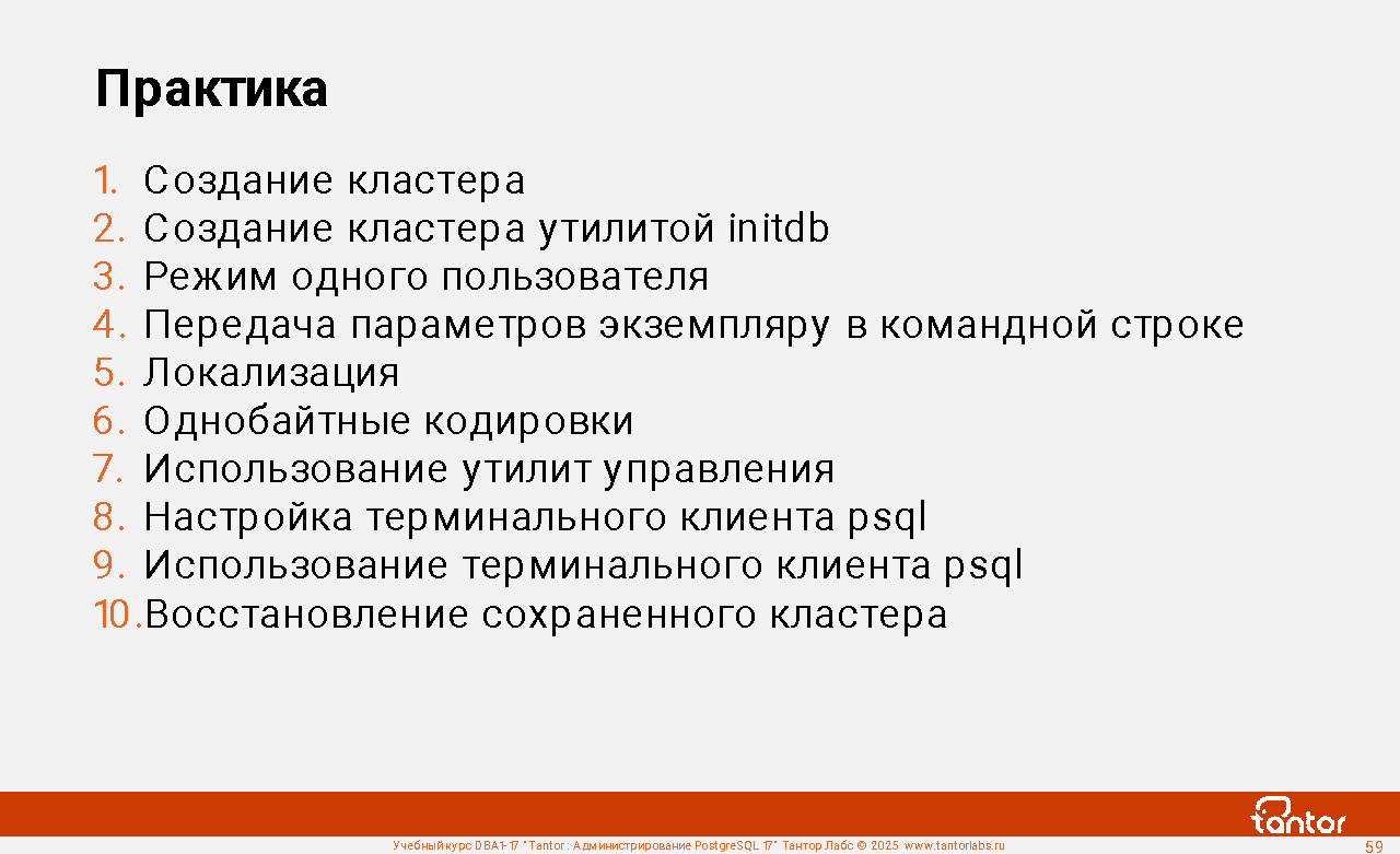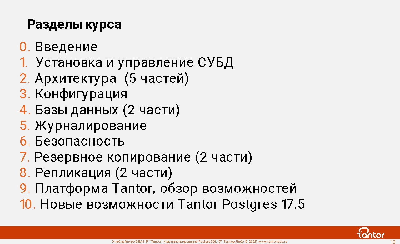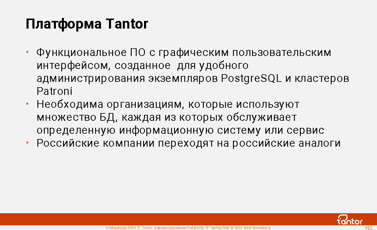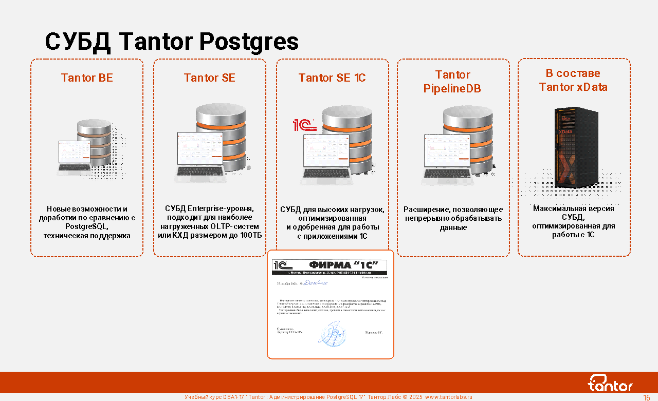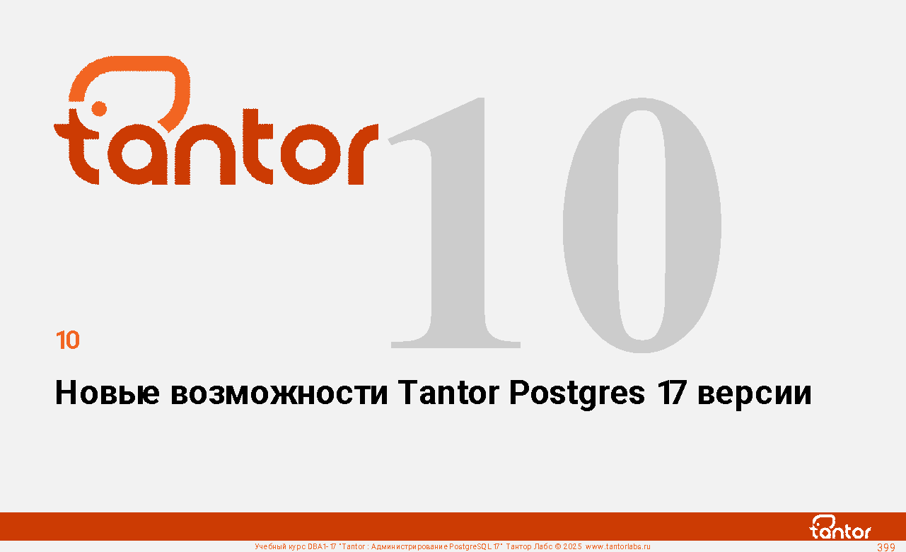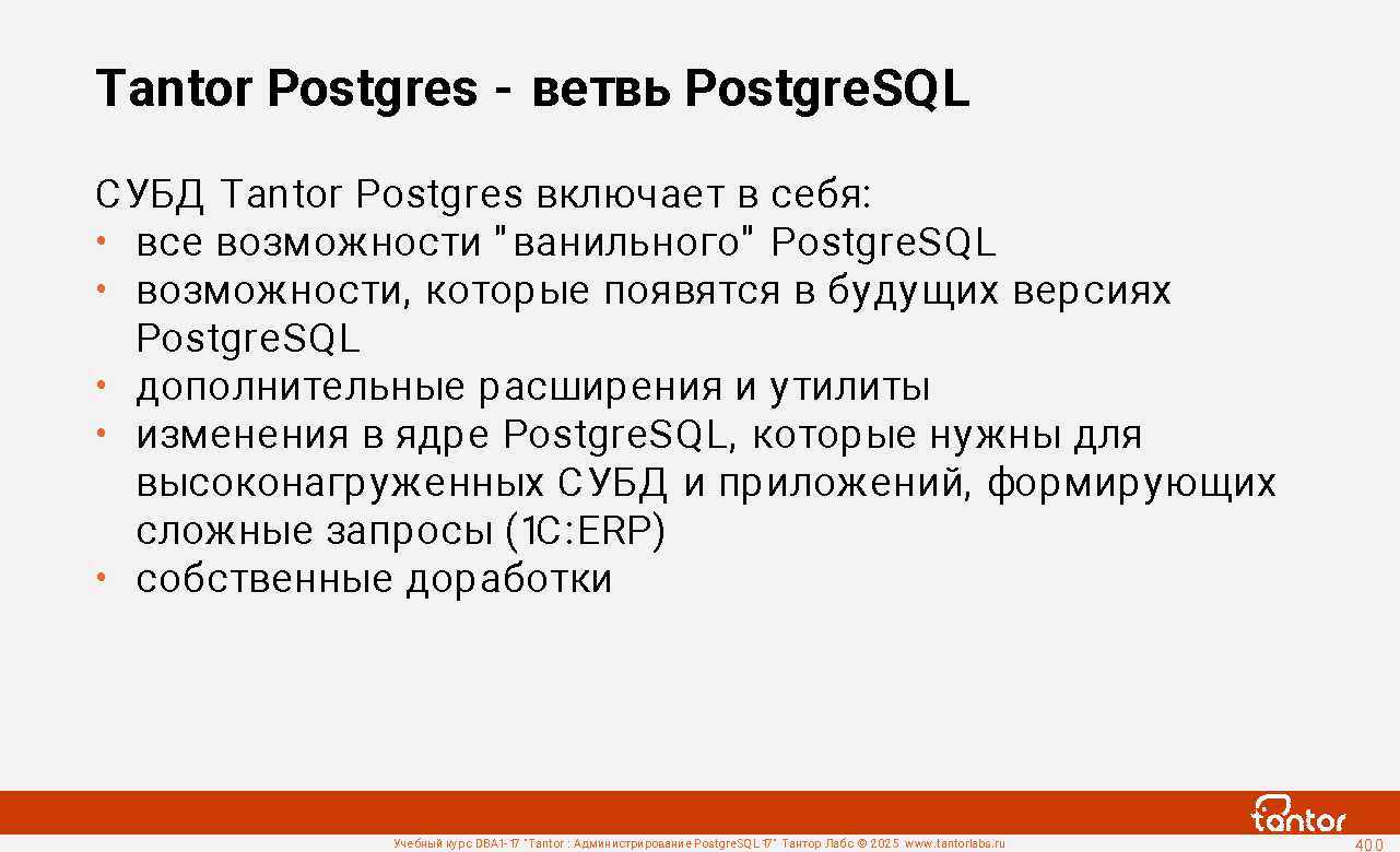 В курсе будут рассмотрены основные задачи администрирования баз данных семейства PostgreSQL на примере СУБД Tantor Postgres и особенности эксплуатации СУБД Tantor Postgres.
