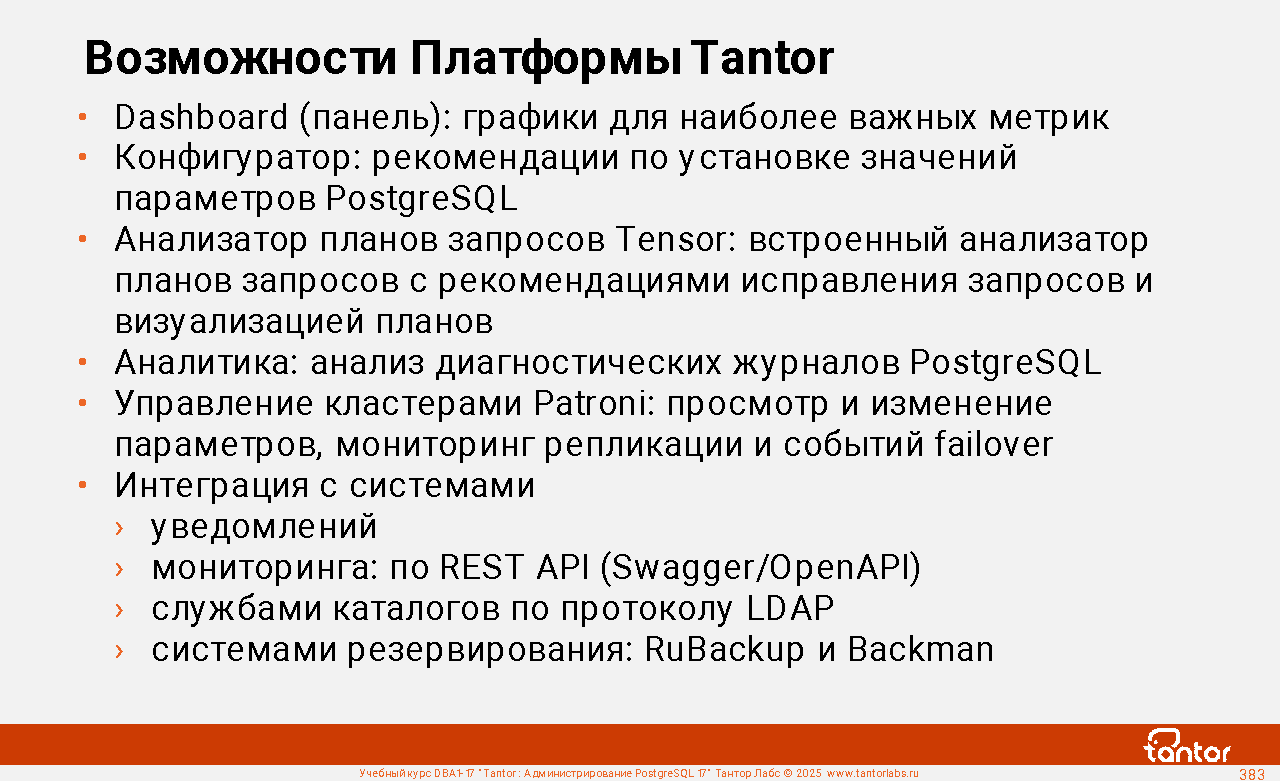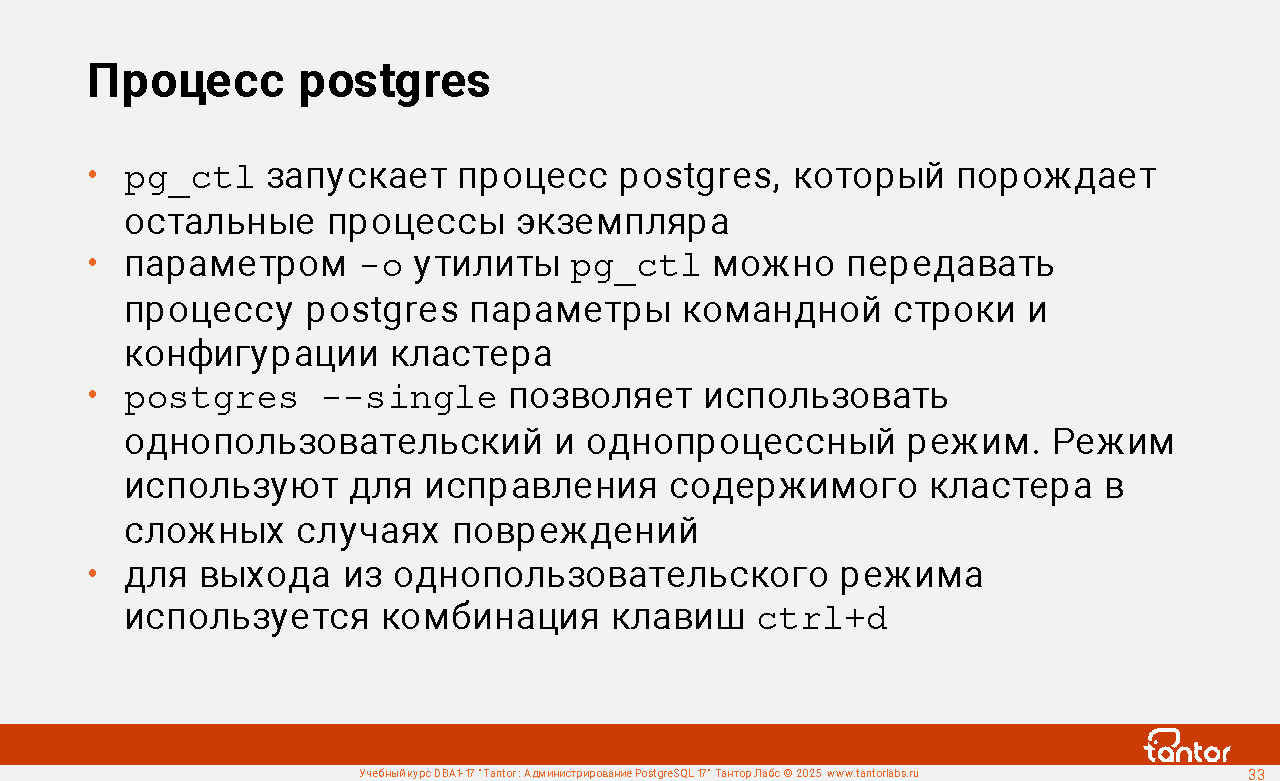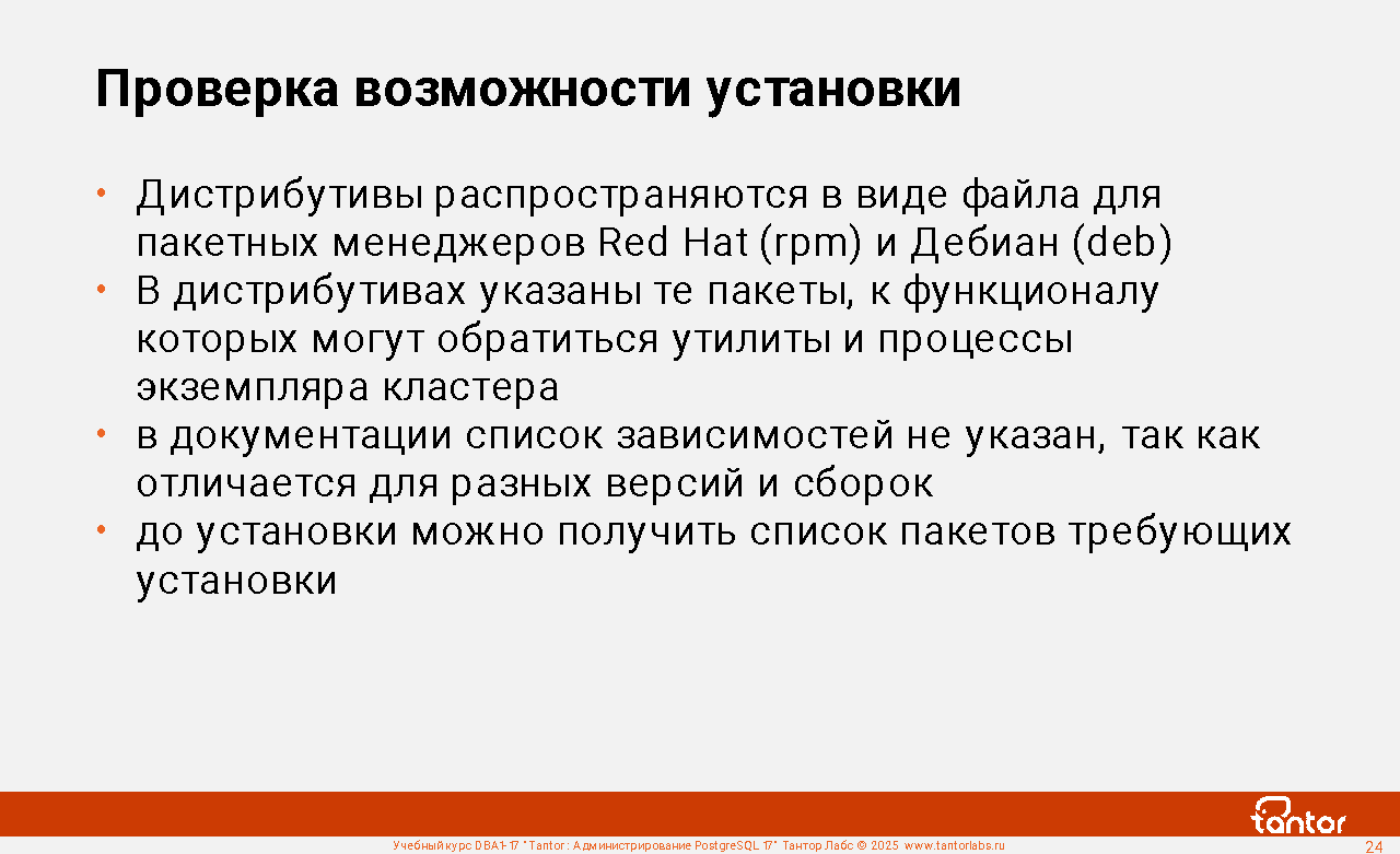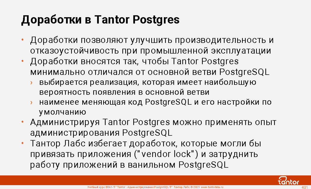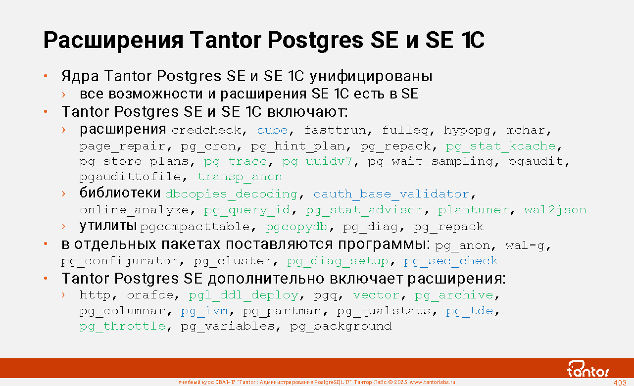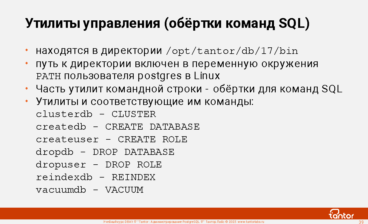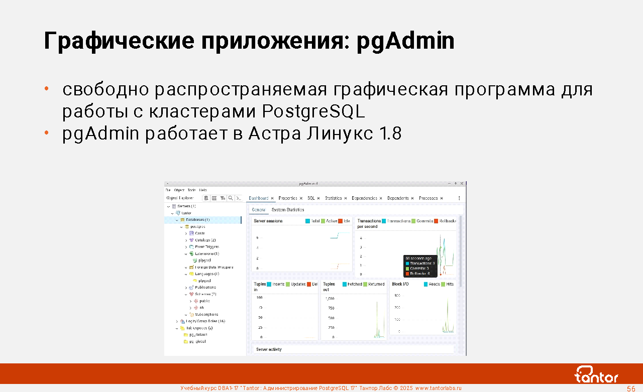 В курсе будут рассмотрены основные задачи администрирования баз данных семейства PostgreSQL на примере СУБД Tantor Postgres и особенности эксплуатации СУБД Tantor Postgres.