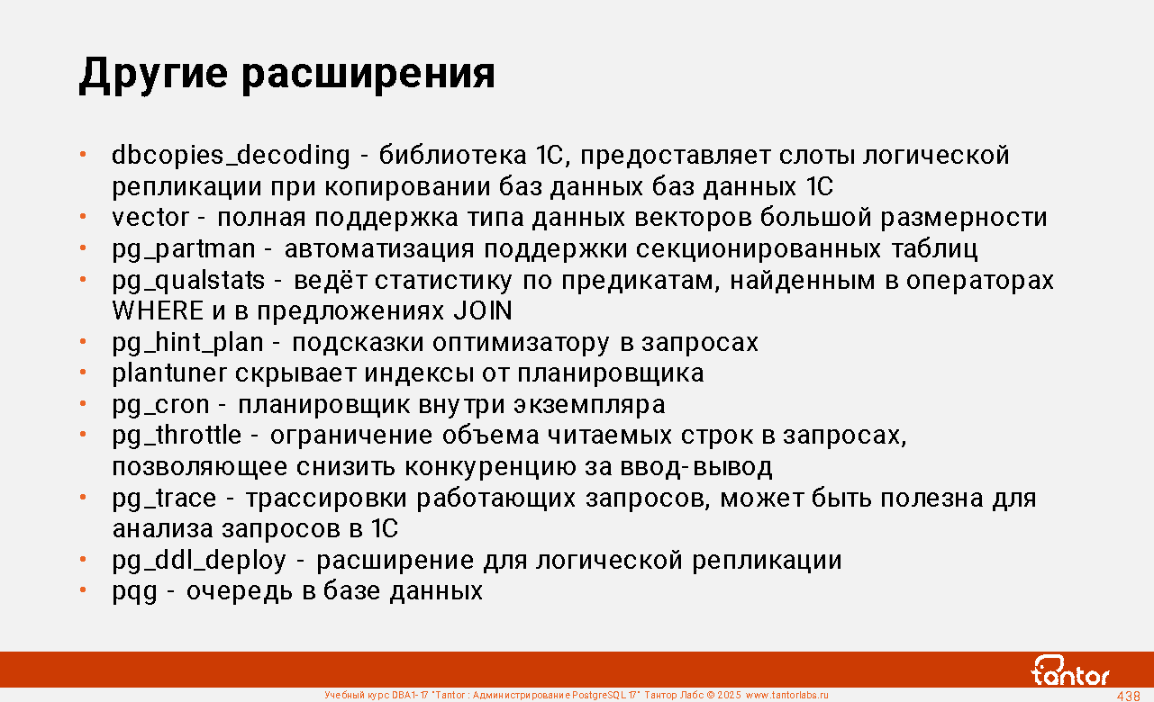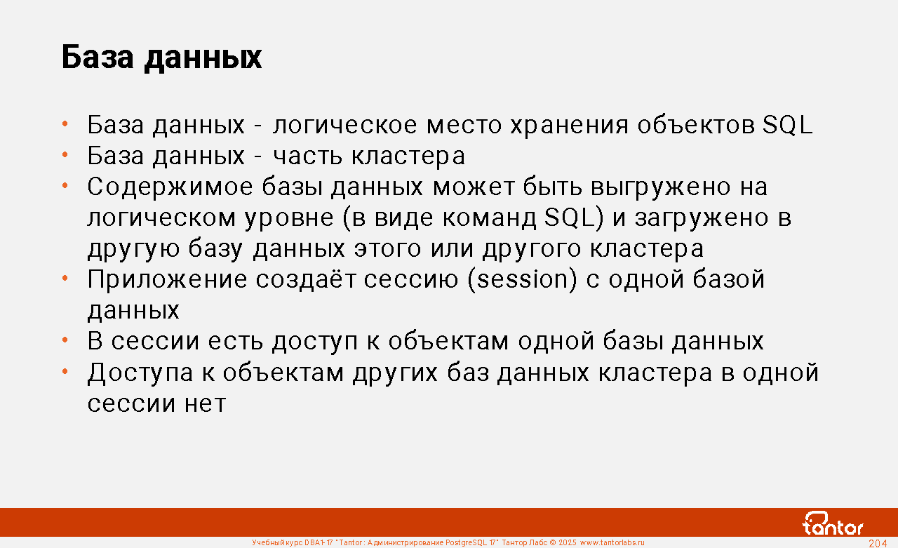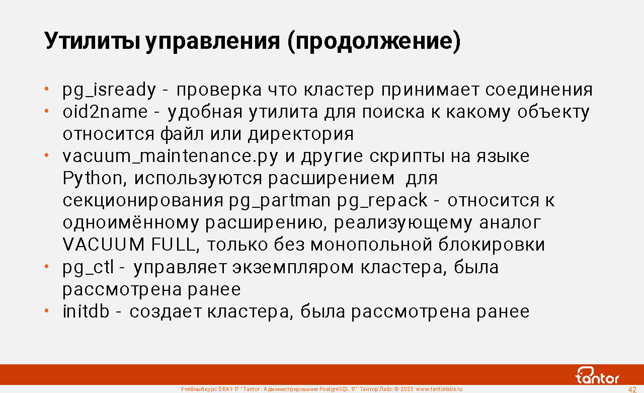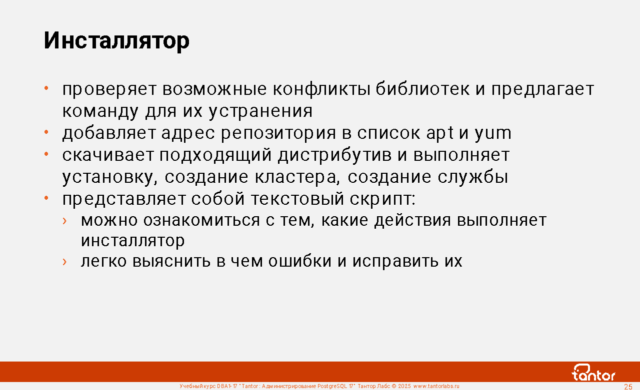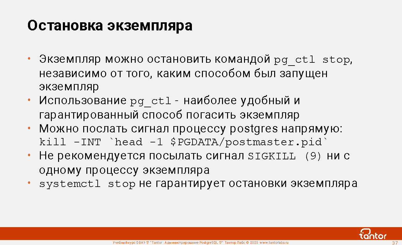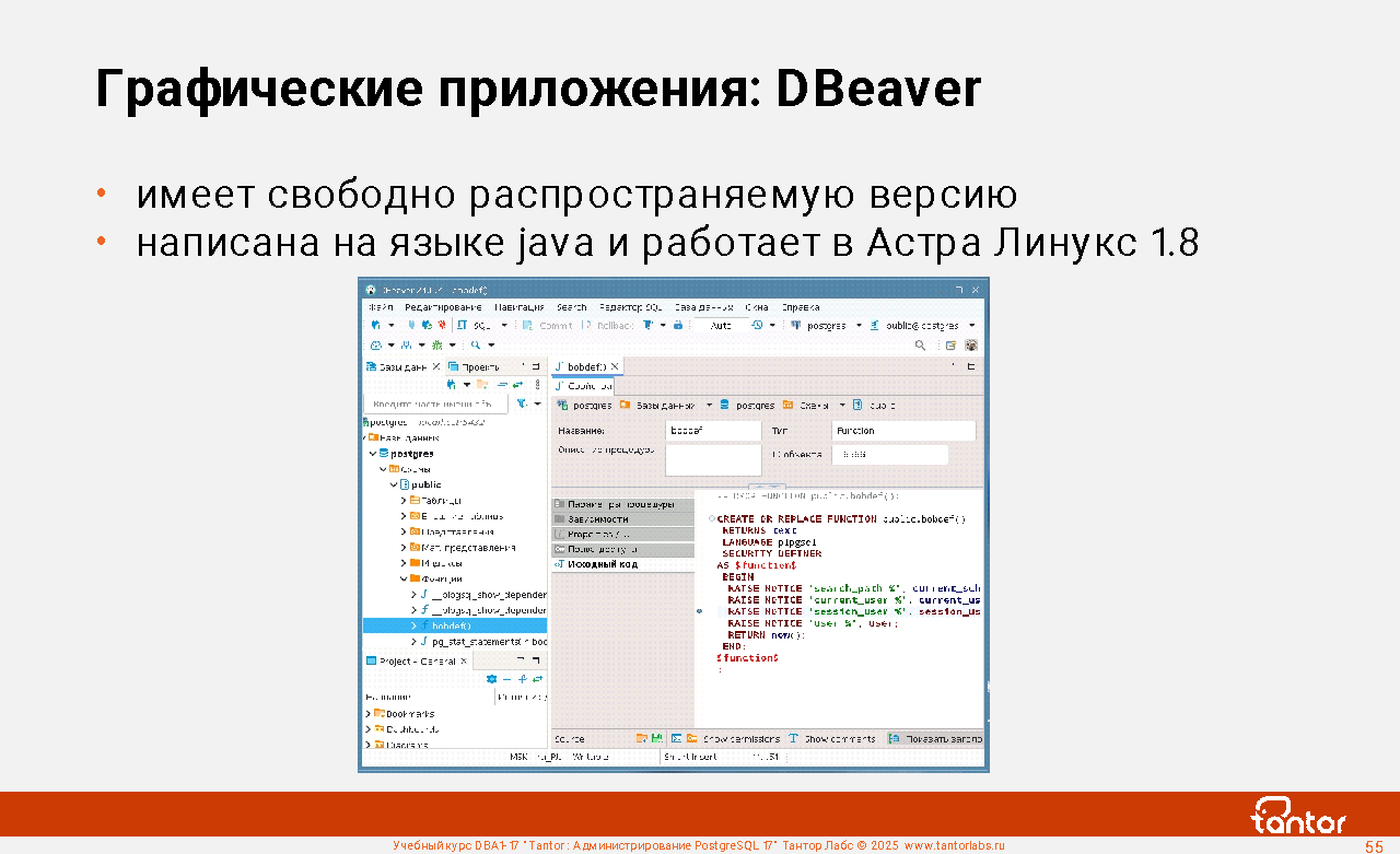В курсе будут рассмотрены основные задачи администрирования баз данных семейства PostgreSQL на примере СУБД Tantor Postgres и особенности эксплуатации СУБД Tantor Postgres.