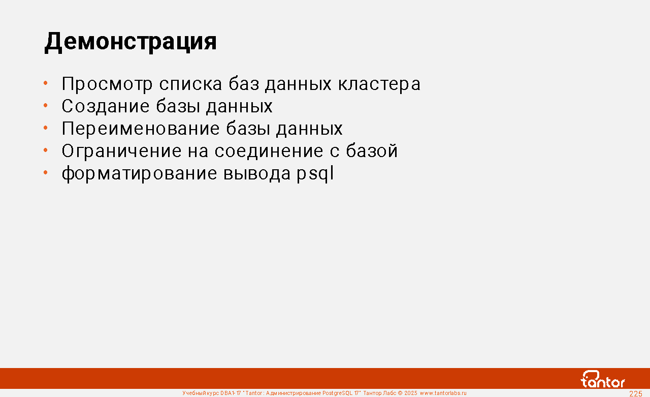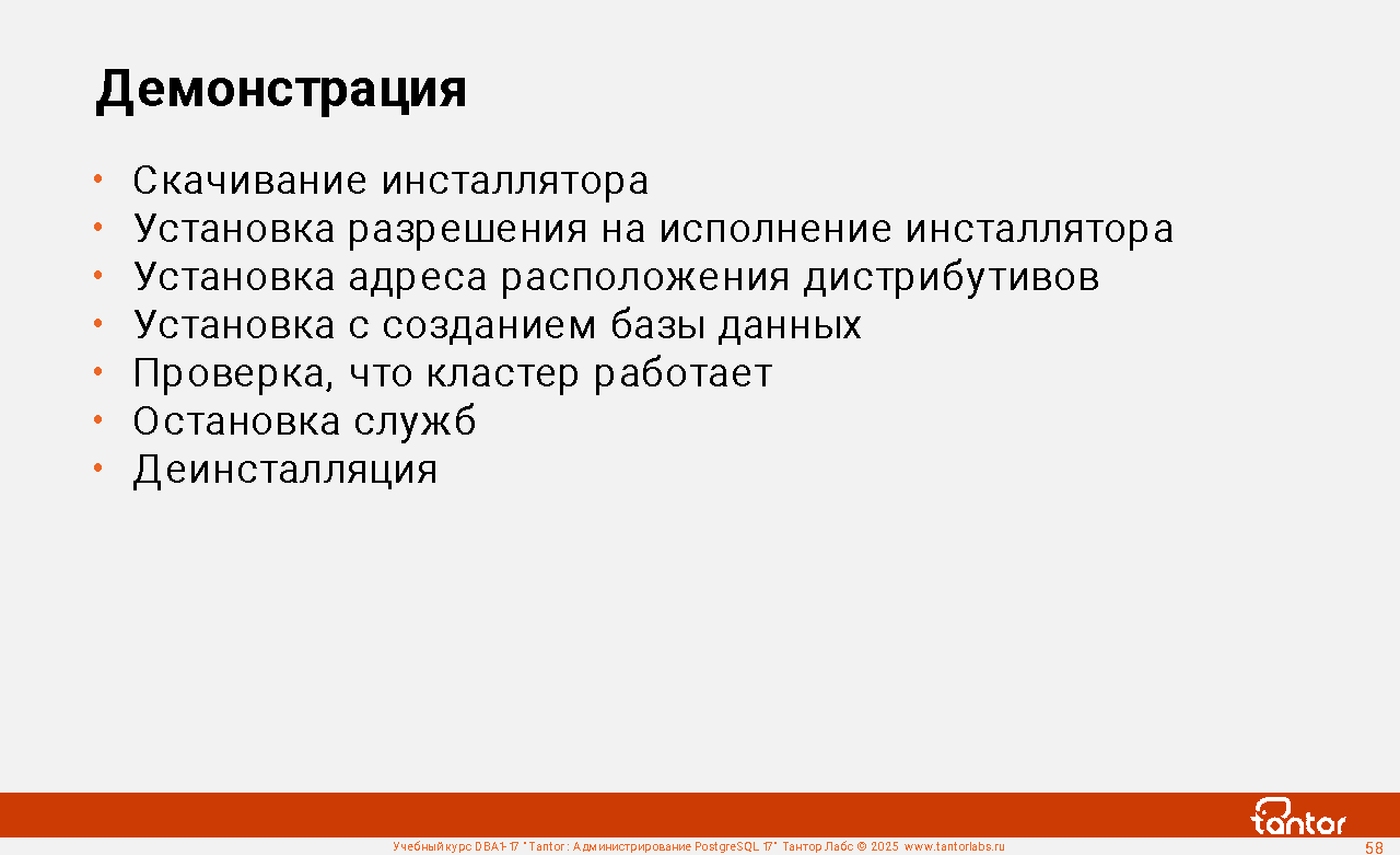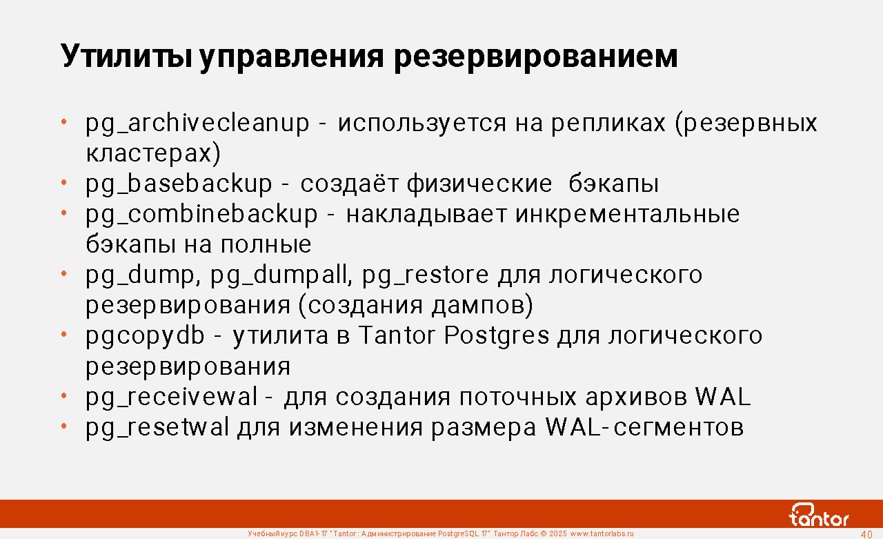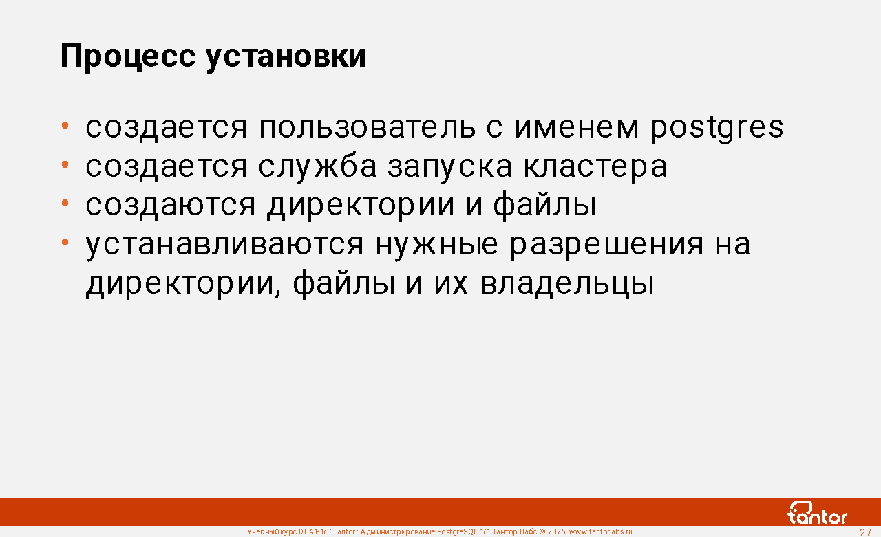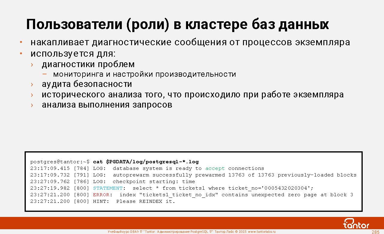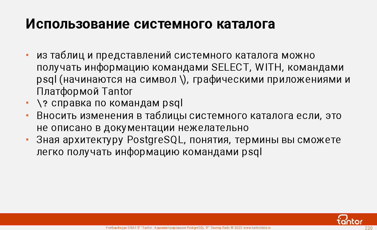 В курсе будут рассмотрены основные задачи администрирования баз данных семейства PostgreSQL на примере СУБД Tantor Postgres и особенности эксплуатации СУБД Tantor Postgres.