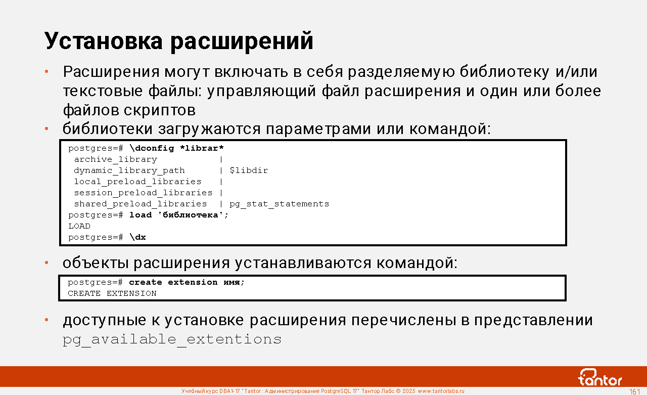 4) Проверяет доступность расширений через pg_available_extensions, подсоединившись к экземпляру через Unix-сокет;