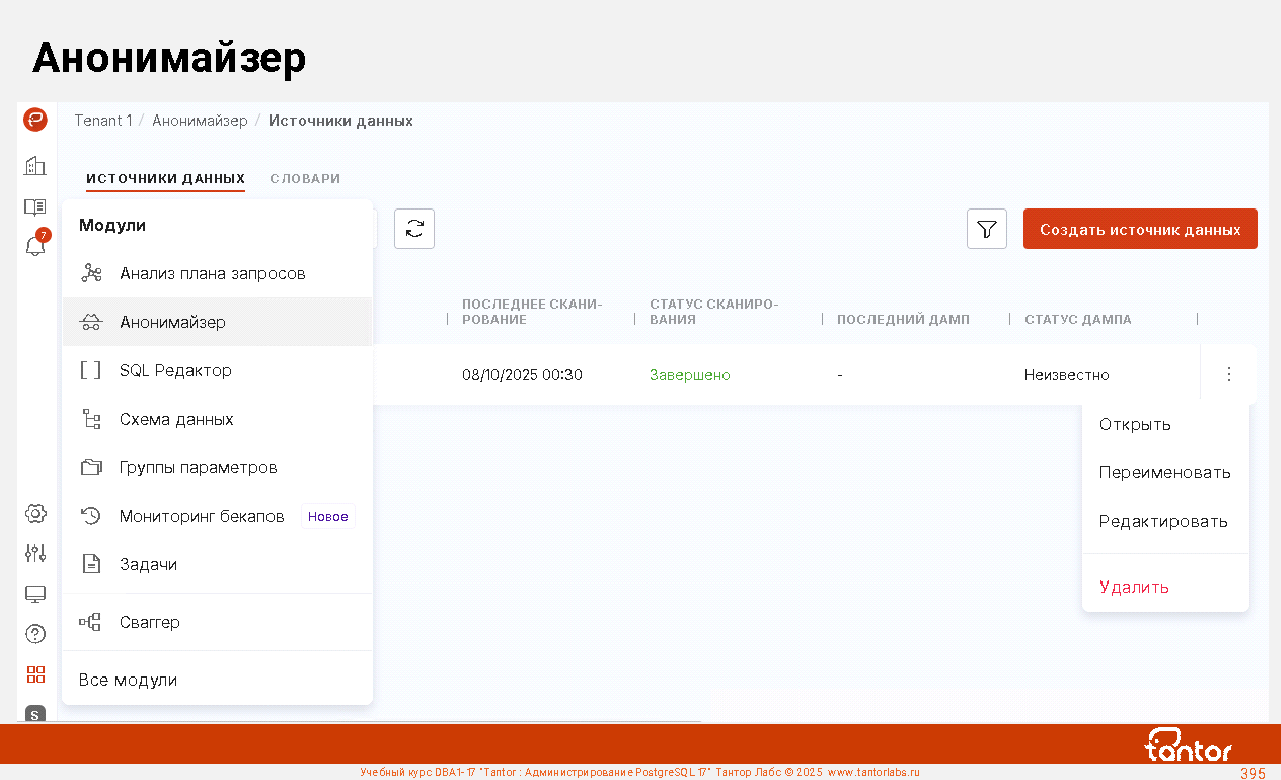 Платформа Tantor имеет удобный и интуитивно понятный графический интерфейс к приложению pg_anon.