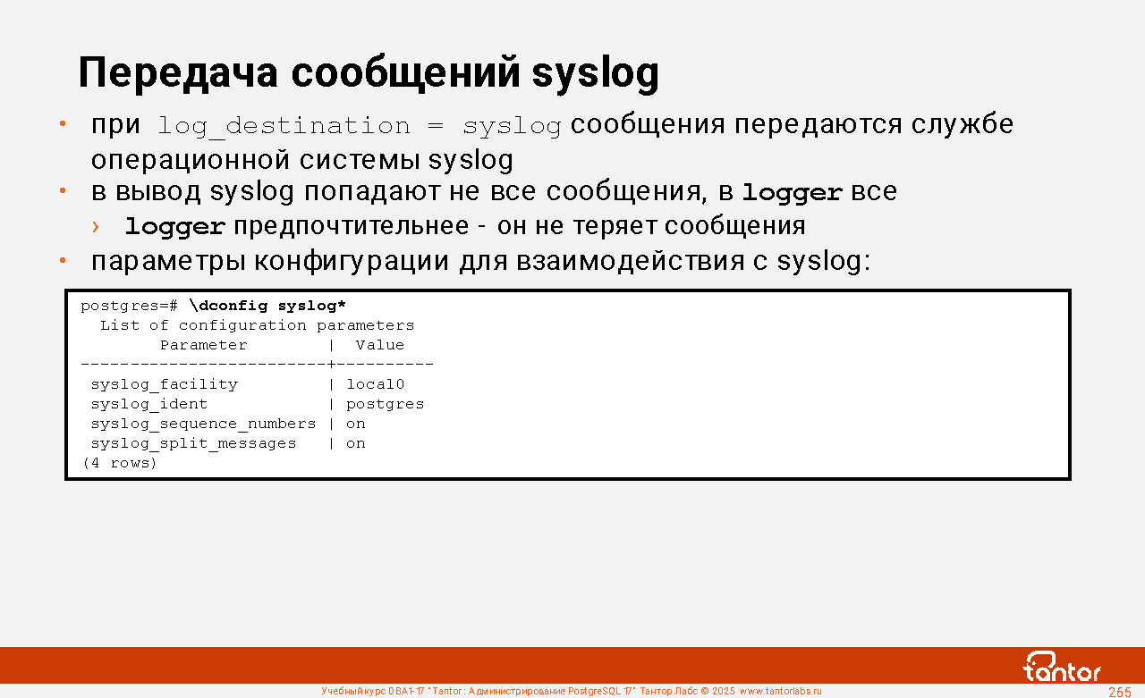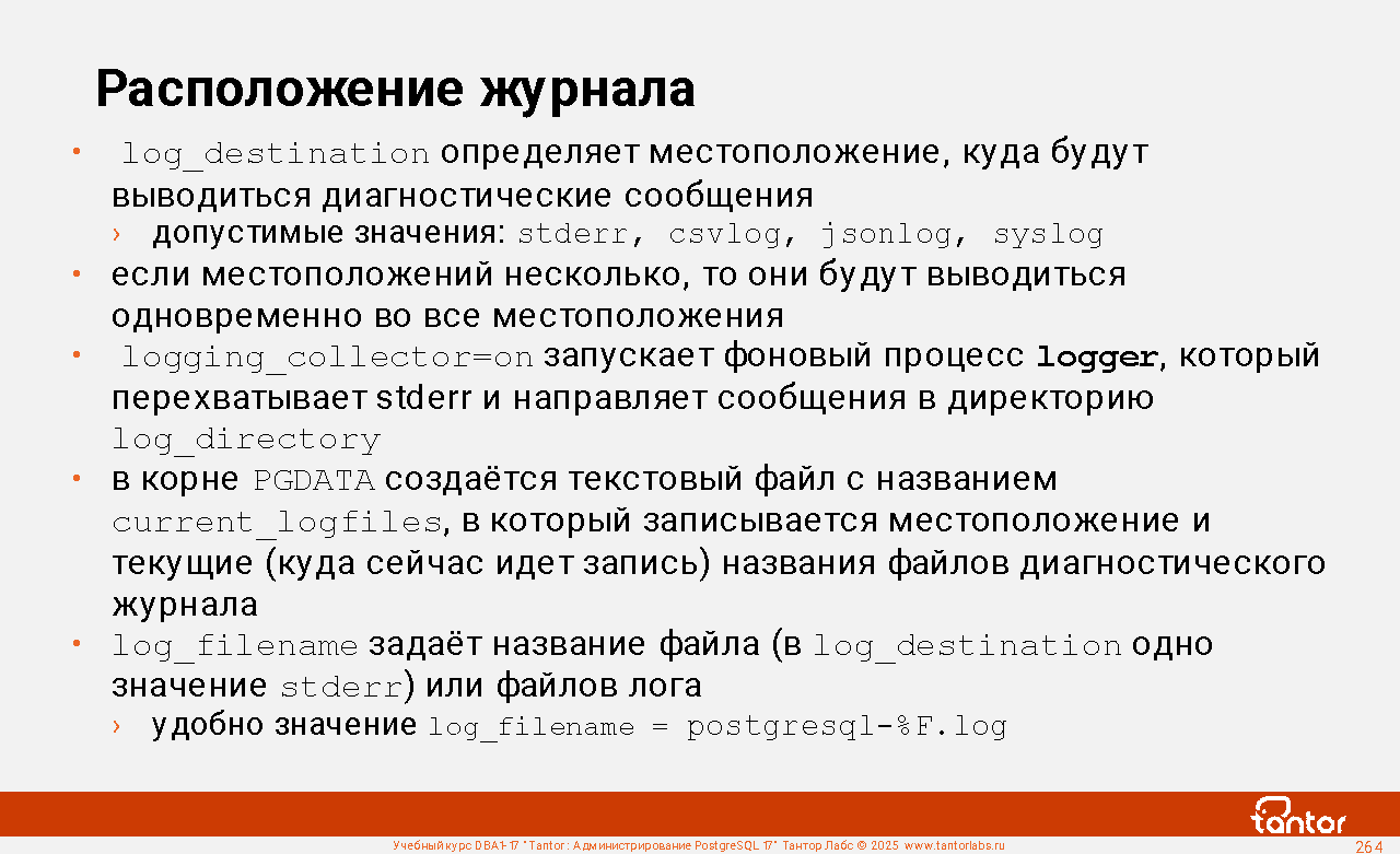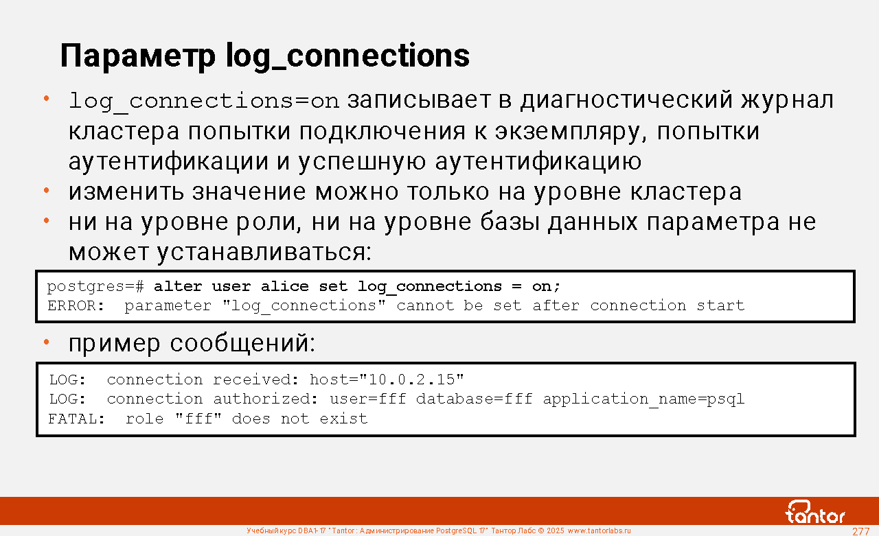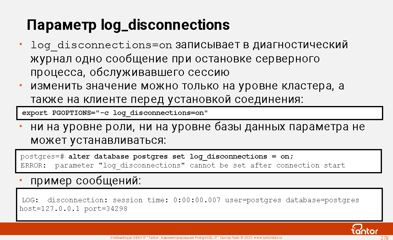 При использовании параметров log_connections и log_disconnections сообщения записываются в журнал кластера. При промышленной эксплуатации, в журнал записывается множество сообщений. Логирование соединений не нужно для повседневного анализа и замусоривает общий журнал, затрудняя чтение более важных сообщений и желательно, чтобы логирование соединений, команд ddl и других команд выполнялось в не в журнал кластера, а в отдельный файл или файлы.