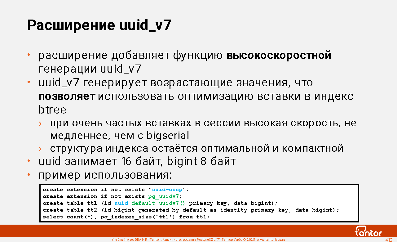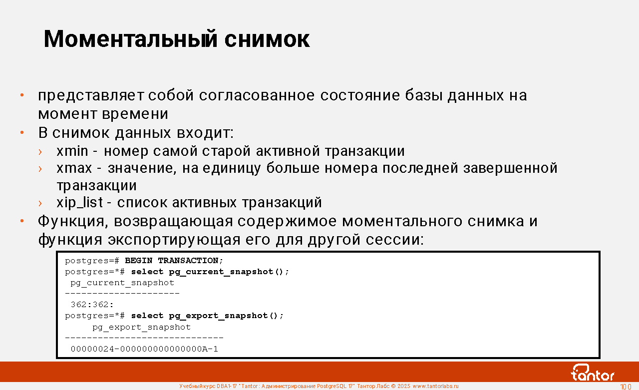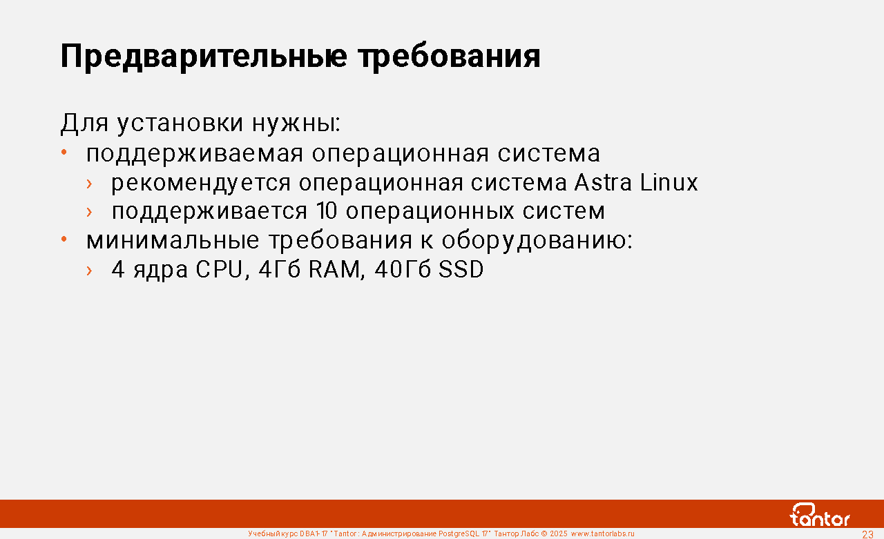 3) Виртуальная машина с установленной операционной системой Astra Linux 1.8 и СУБД Tantor Postgres версии 17.5. Может предоставляться доступ к виртуальной машине на время курса или образ в формате ova. Образ виртуальной машины можно использовать с Oracle VirtualBox версии 6.1 и выше.