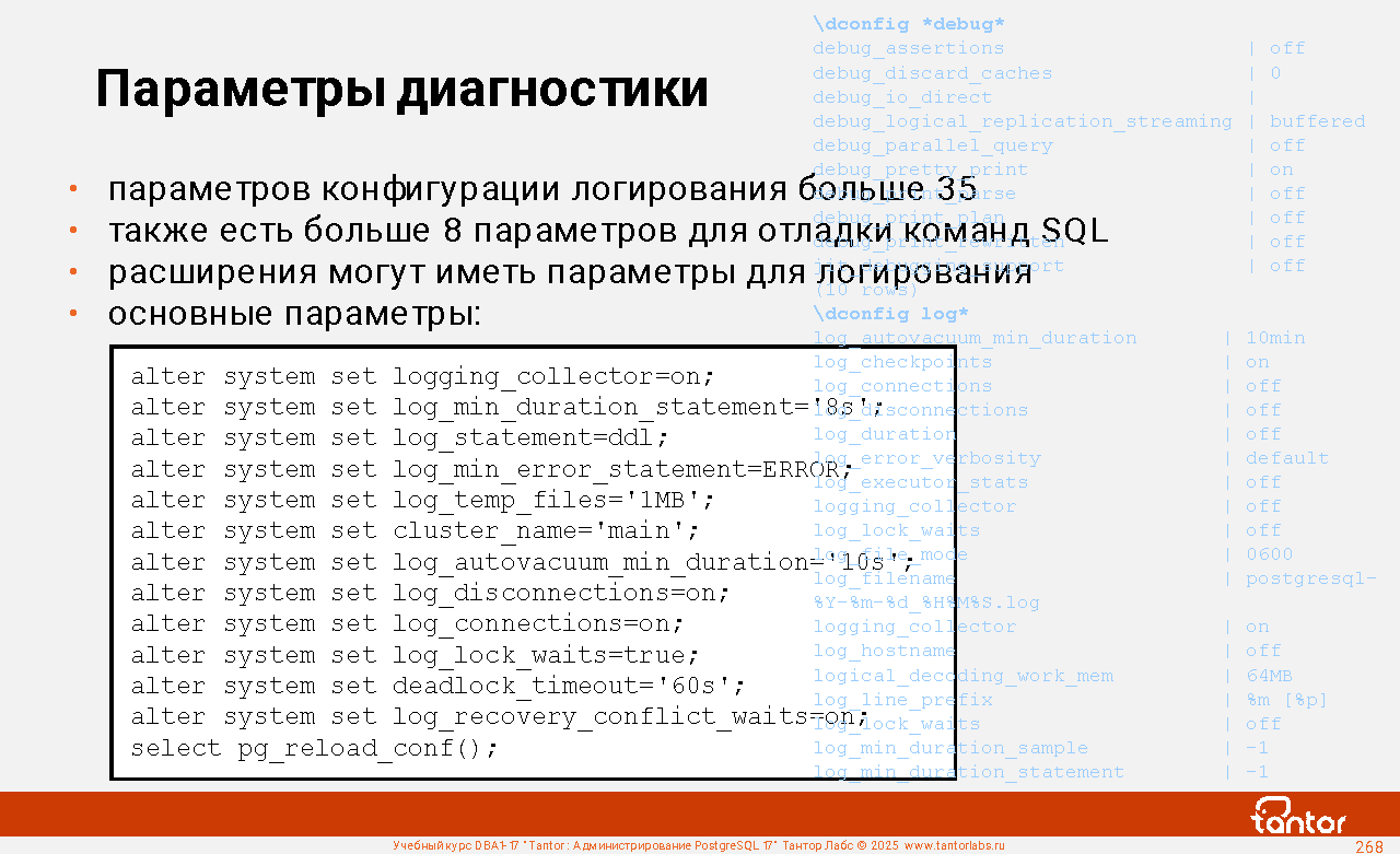 6) Добавляет новые параметры в конец postgresql.conf, помечая добавленные параметры комментарием "Added by pg_diag_setup"
