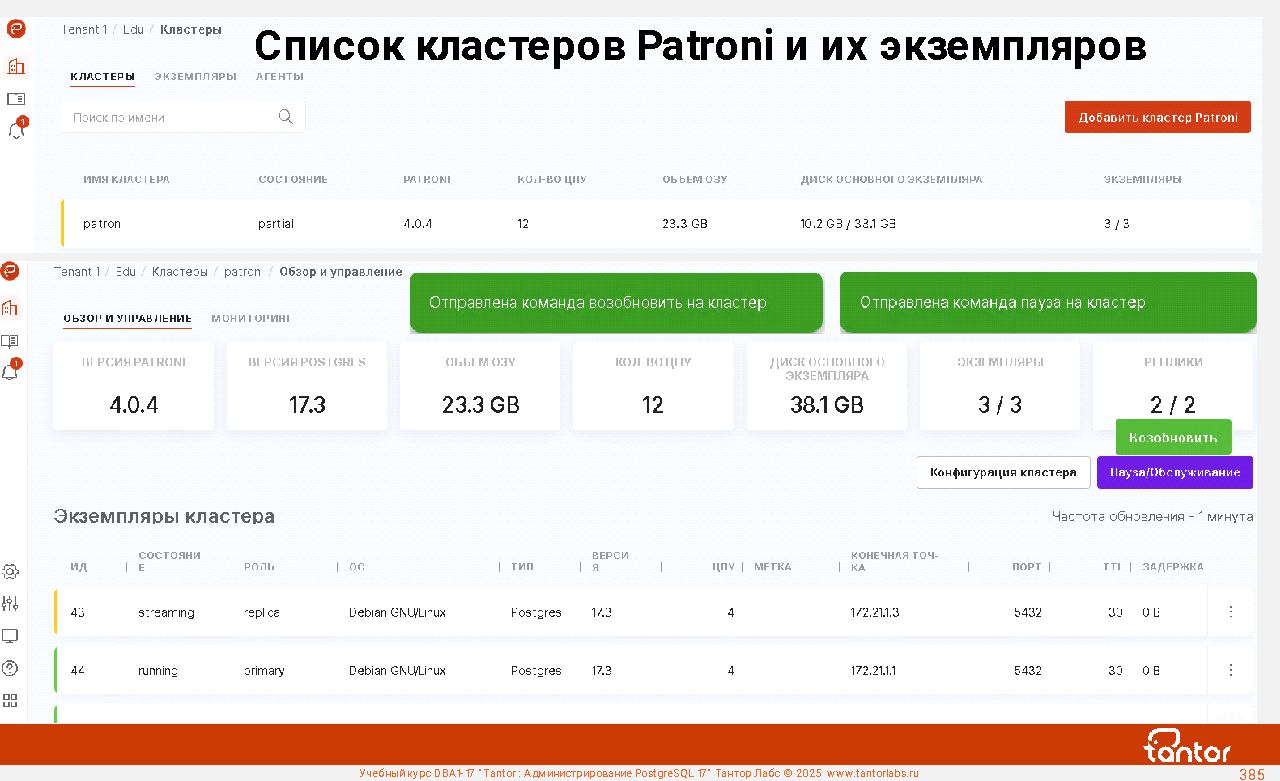 Платформа Tantor - программное обеспечение для управления СУБД Tantor Postgres, форками PostgreSQL, кластерами Patroni. Позволяет удобно управлять большим количеством СУБД. Относится к классу программных продуктов, в который входит Oracle Enterprise Manager Cloud Control.