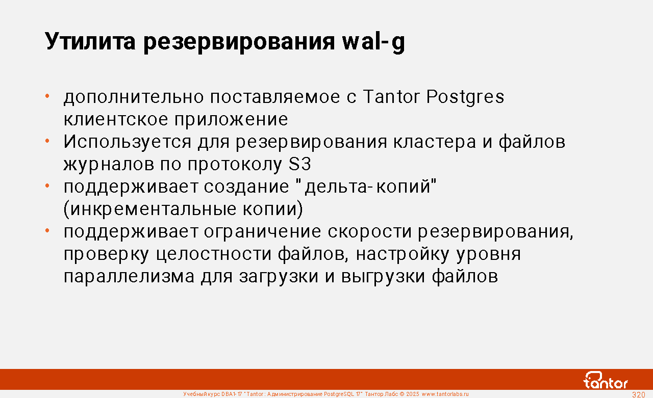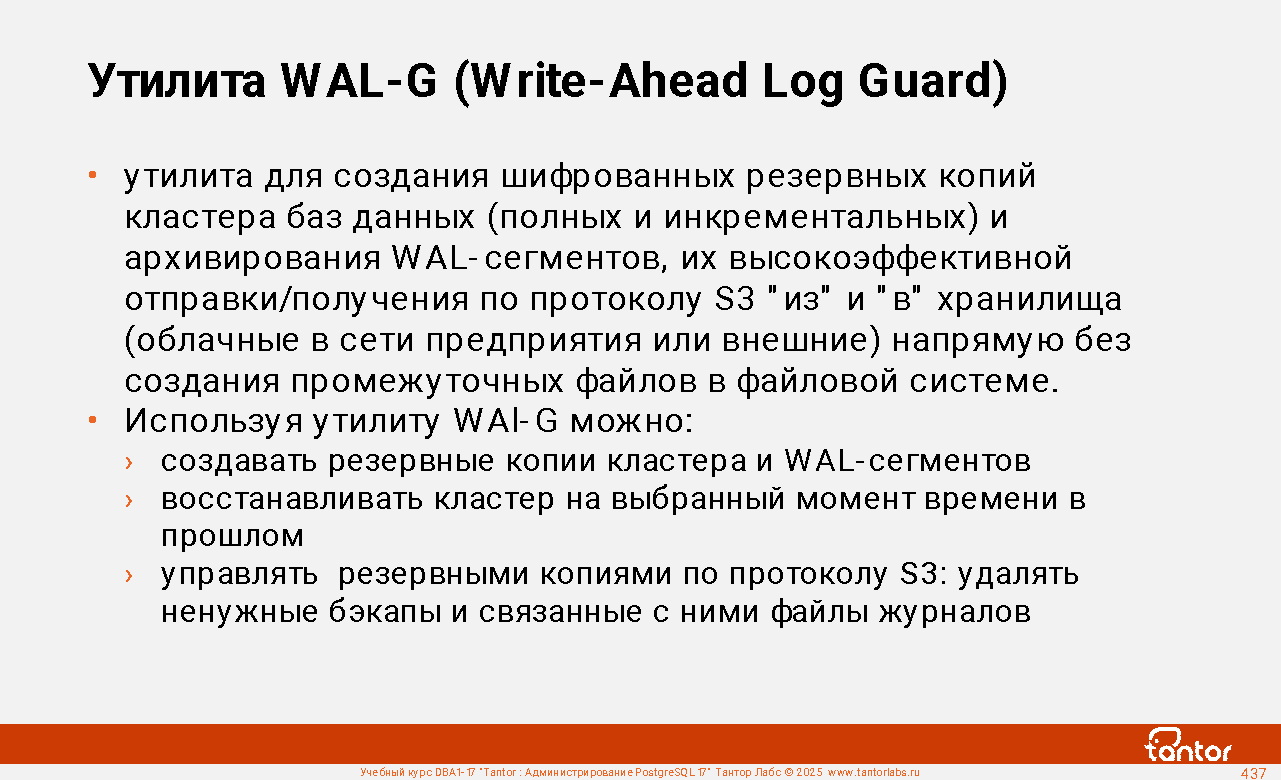 WAL-G (Write-Ahead Log Guard) - утилита командной строки для создания шифрованных резервных копий кластера баз данных и архивирования WAL-файлов, их эффективной отправки/получения в несколько потоков (с максимальной скоростью и минимальной нагрузке на процессора и память) по протоколу S3 "из" и "в" хранилища (облачные в сети предприятия или внешние) напрямую, без создания промежуточных файлов в файловой системе хоста. WAL-G разработана для эффективного резервирования использования WAL-сегментов, но также способна создавать резервные копии PGDATA кластера.