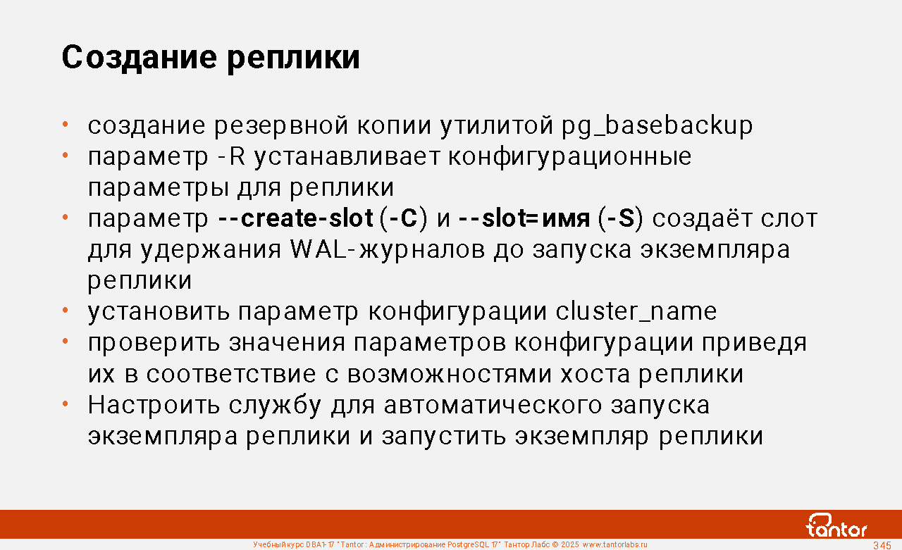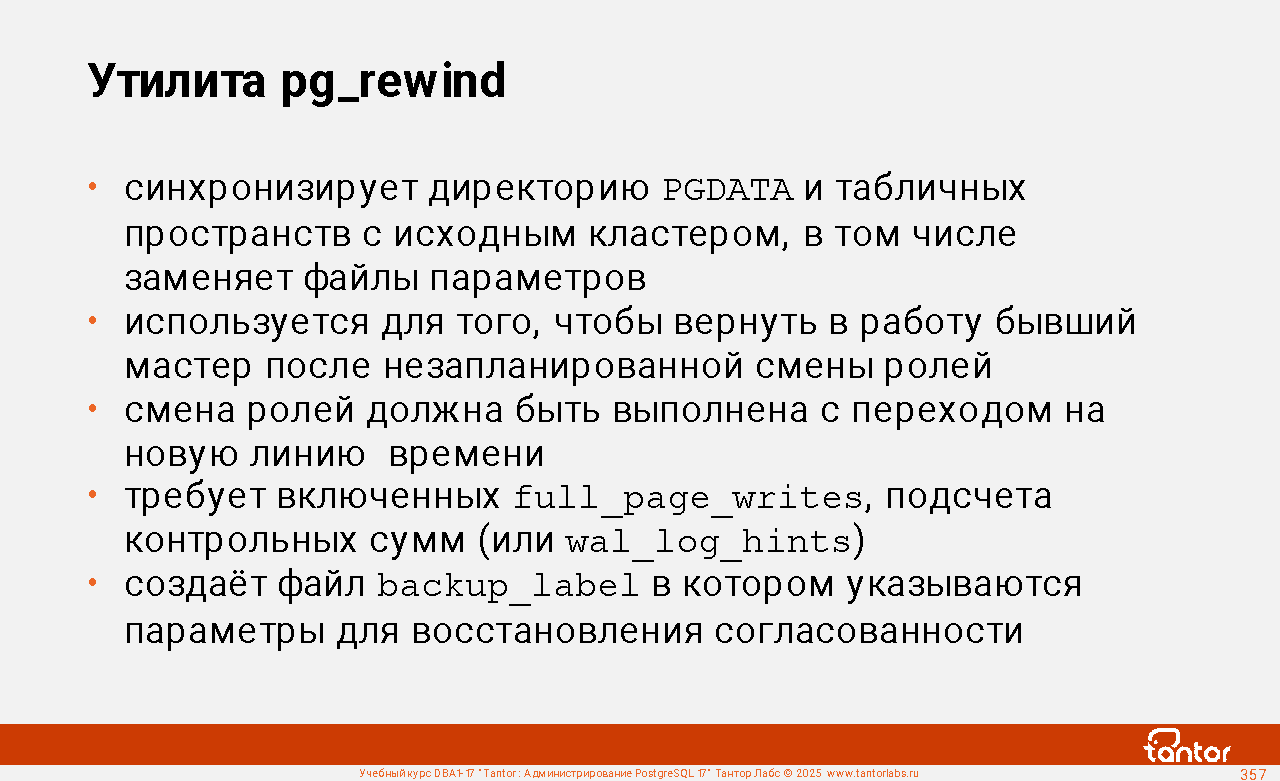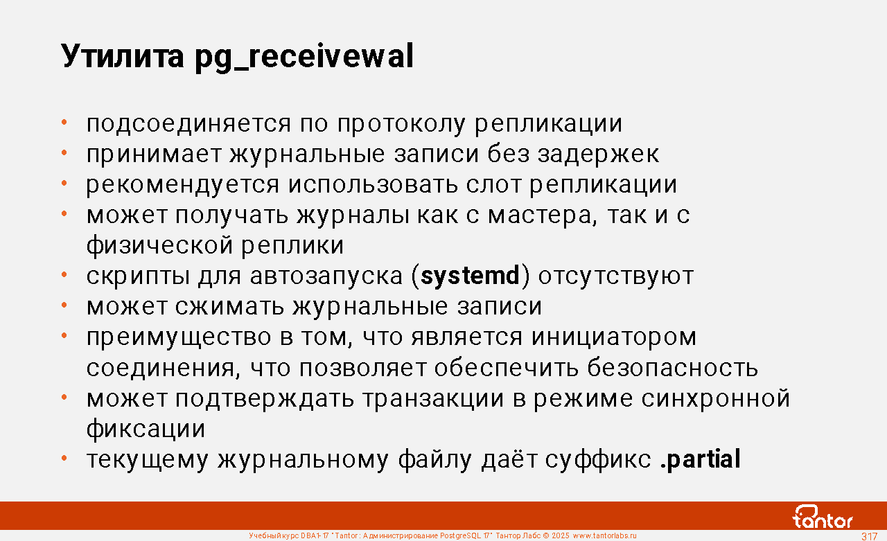 1) создавать резервные копии кластера и WAL-сегментов в режиме "push". Текущий WAL-сегмент не резервируется и утилита не может использоваться как единственное решение по обеспечению высокой доступности.