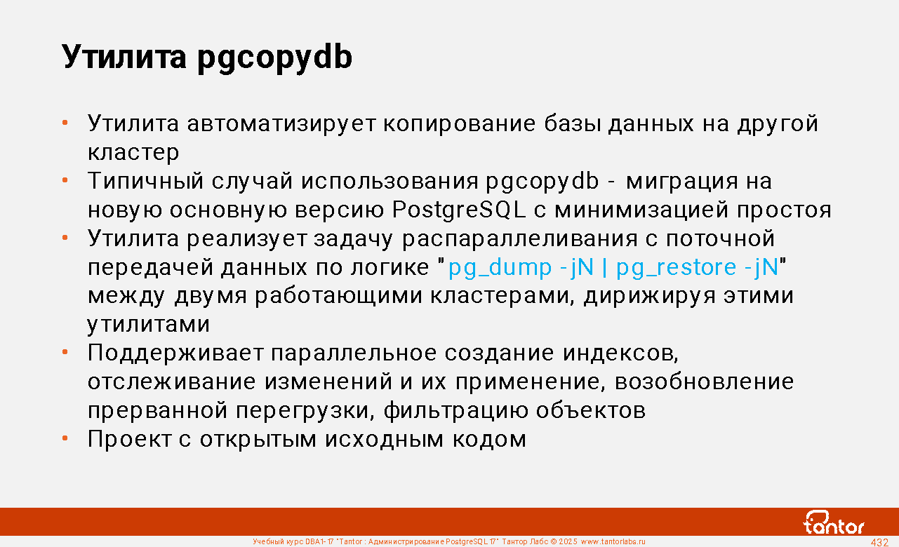 Утилита автоматизирует копирование базы данных на другой кластер. Типичный случай использования pgcopydb - миграция на новую основную версию PostgreSQL с минимизацией простоя. Утилита реализует задачу распараллеливания с поточной передачей данных по логике "pg_dump -jN | pg_restore -jN" между двумя работающими кластерами, дирижируя этими утилитами. Поддерживает параллельное создание индексов, отслеживание изменений и их применение, возобновление прерванной перегрузки, фильтрацию объектов.