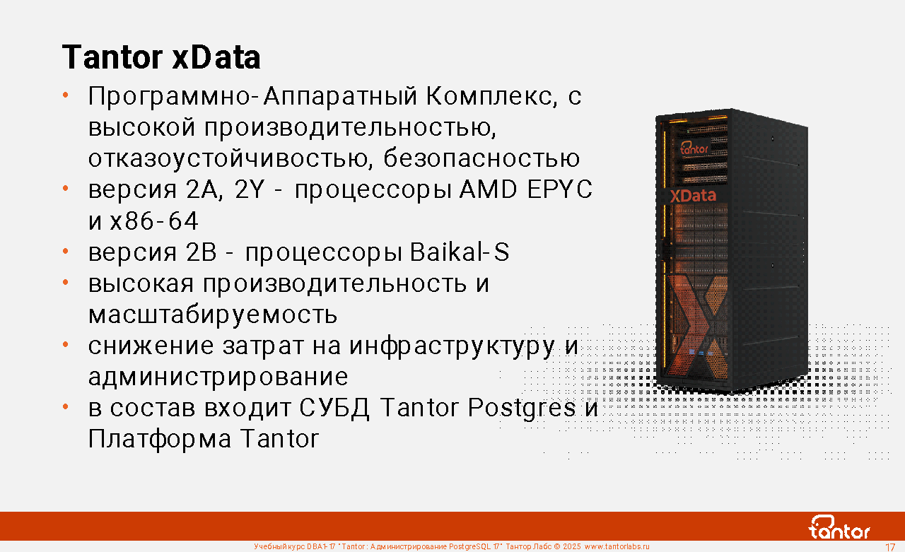 Программно-аппаратный комплекс (ПАК) Tantor XData предназначен миграции с комплексов иностранных производителей и обеспечивает аналогичную нагрузочную способность. Является заменой высоконагруженным СУБД размером до ~50Тб на один экземпляр, обслуживающие нагрузку типа OLTP, работающие на программно-аппаратных комплексах иностранных производителей. Для СУБД, обслуживающих хранилища данных размером до ~120Тб на один экземпляр.