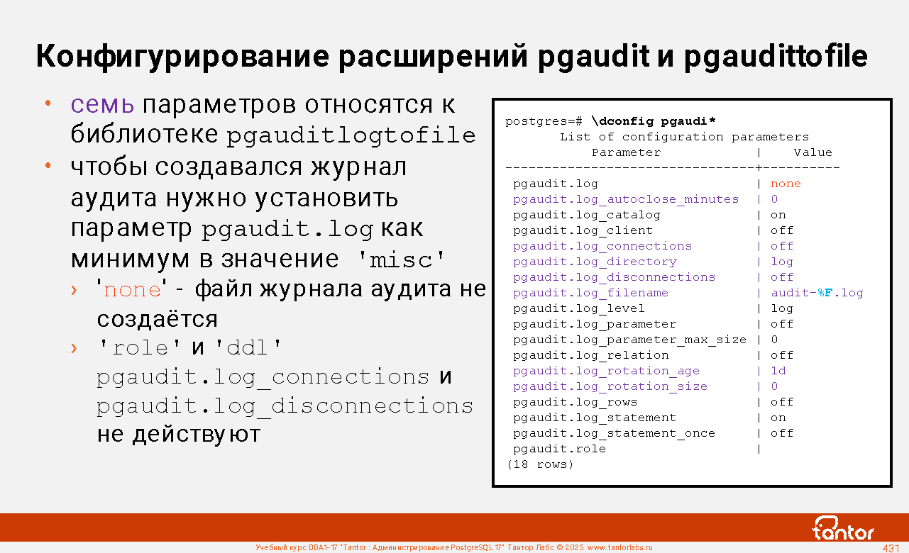 У расширения 18 параметров. 7 параметров относятся к библиотеке pgauditlogtofile, в том числе параметры pgaudit.log_connections и pgaudit.log_disconnections. Эти параметры аналогичны одноимённым параметрам PostgreSQL и могут создавать аналогичные записи, но только в отдельном файле аудита, а не в журнале кластера, в чём большое преимущество этих параметров. Преимущество перевешивает недостатки в виде необходимости загрузки двух библиотек и неудобств их использования. Параметры библиотеки устанавливаются только на уровне кластера, указание этих параметров в переменной окружения приводит к ошибке и невозможности соединиться, в отличие от стандартных параметров: export PGOPTIONS="-c pgaudit.log_connections=off"