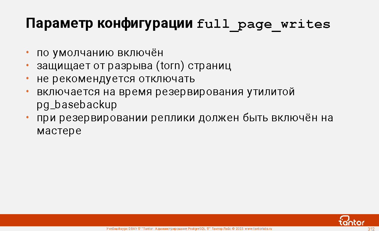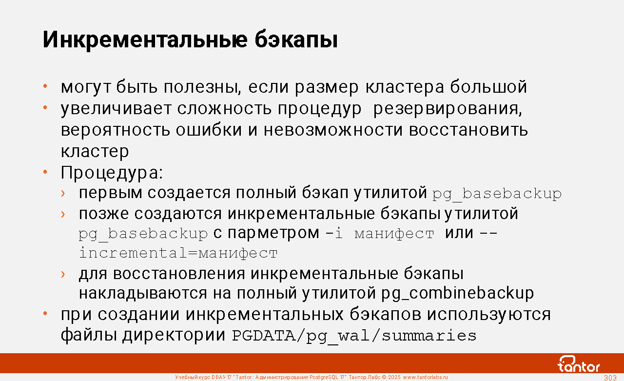 2) восстанавливать кластер на выбранный момент времени в прошлом. Из хранилища возможно восстановить WAL-сегменты кроме текущего (в который писали процессы экземпляра в момент остановки кластера). Полное восстановление (без потери транзакций) возможно только, если текущий WAL-сегмент не был потерян