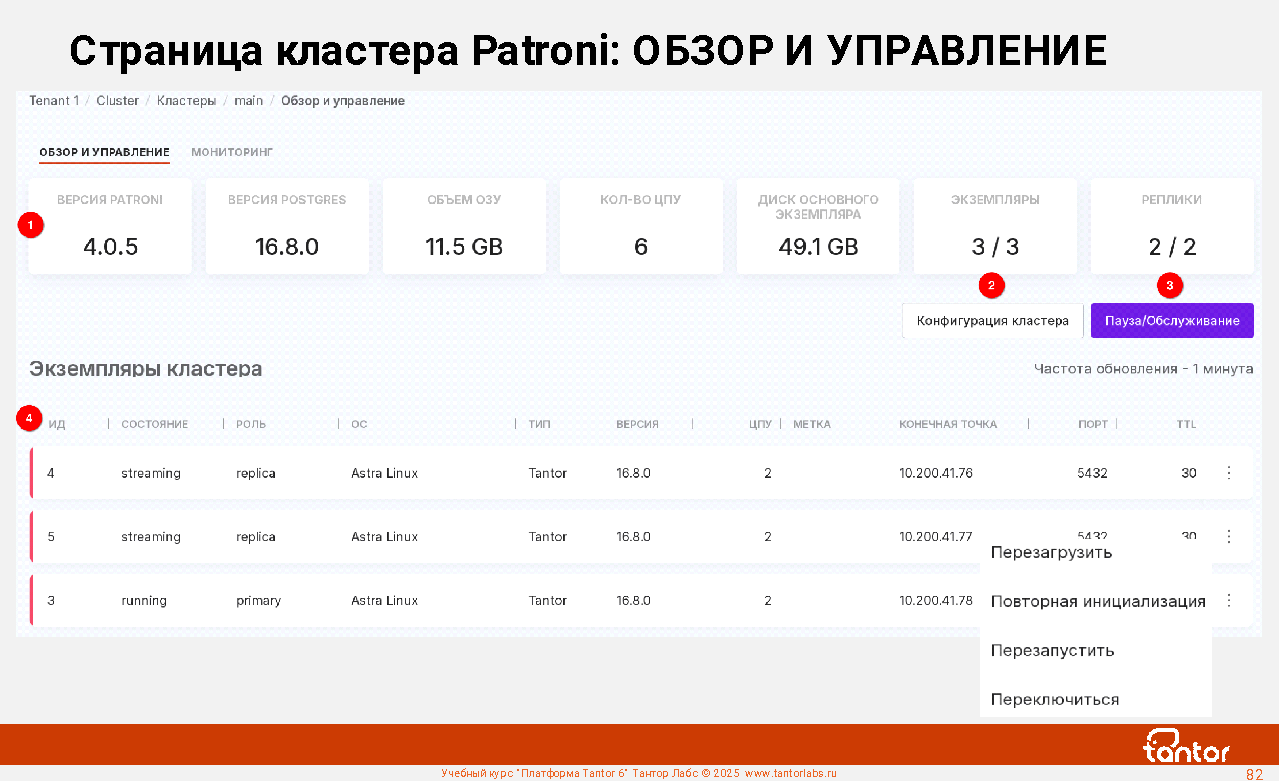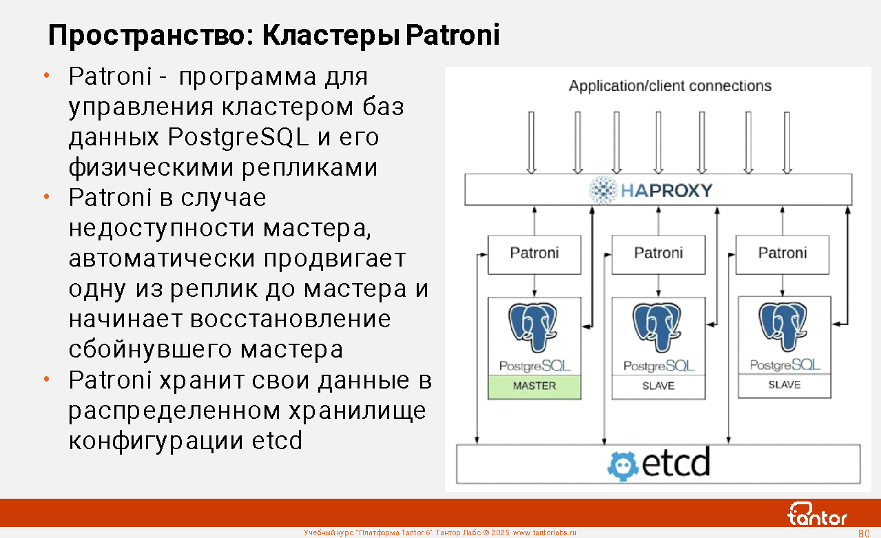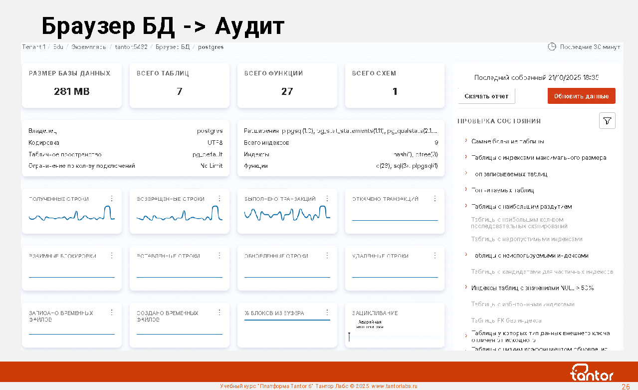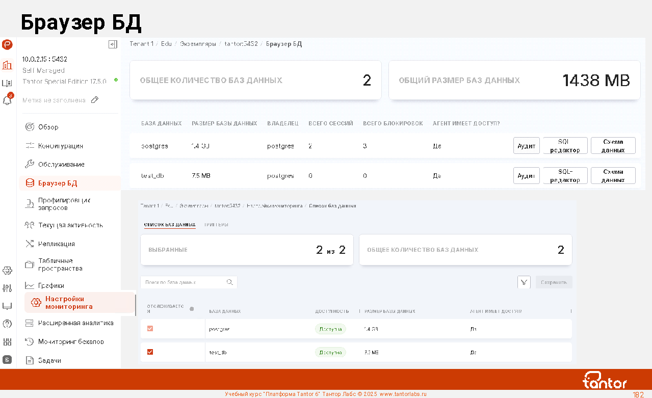 Платформа Tantor - программное обеспечение для управления и мониторинга СУБД Tantor Postgres, любых форков PostgreSQL, кластеров Patroni. Позволяет удобно управлять большим числом экземпляров PostgreSQL.