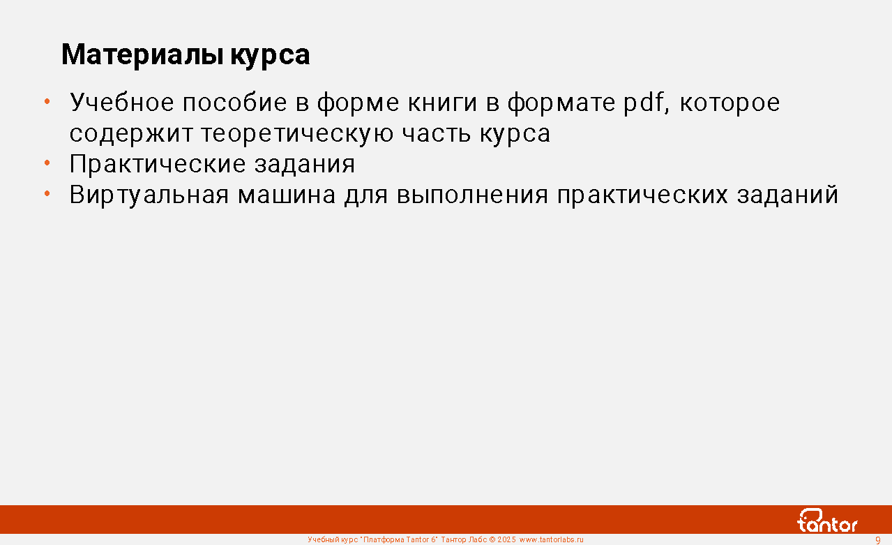 3) Виртуальная машина с установленными в операционной системе Astra Linuх: Платформой Tantor версии 6, СУБД Tantor Postgres версии 17.5. Может предоставляться доступ к виртуальной машине на время курса или образ в формате ova. Образ виртуальной машины можно использовать с Oracle VirtualBox версии 6.1 и выше.