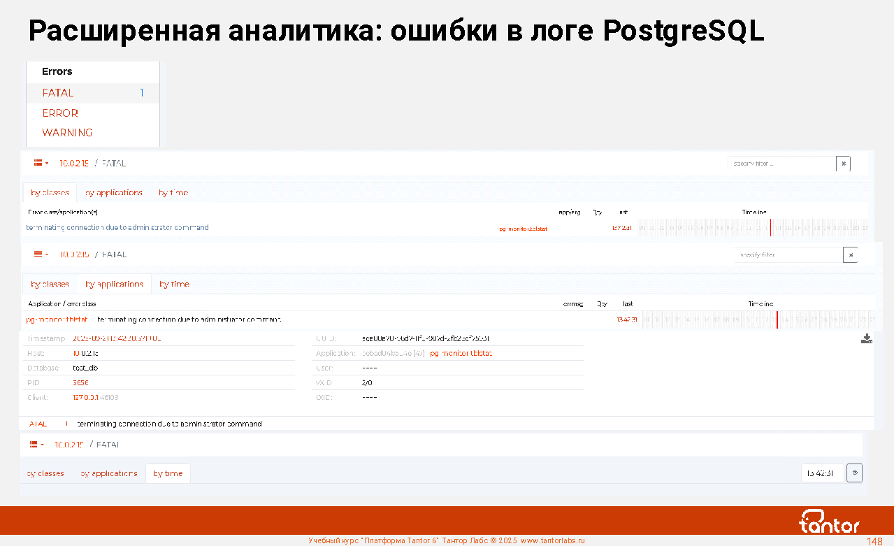 log_line_prefix = '%m [%p:%v] [%d] %r %a ' # больше деталей у сообщений