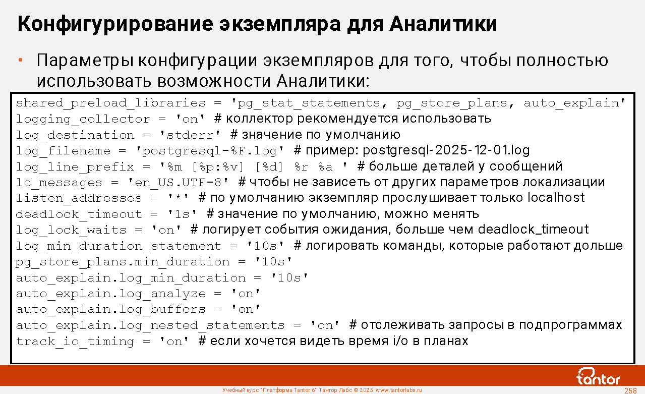 auto_explain.log_nested_statements = 'on'# если хочется отслеживать запросы в подпрограммах (функциях, процедурах)