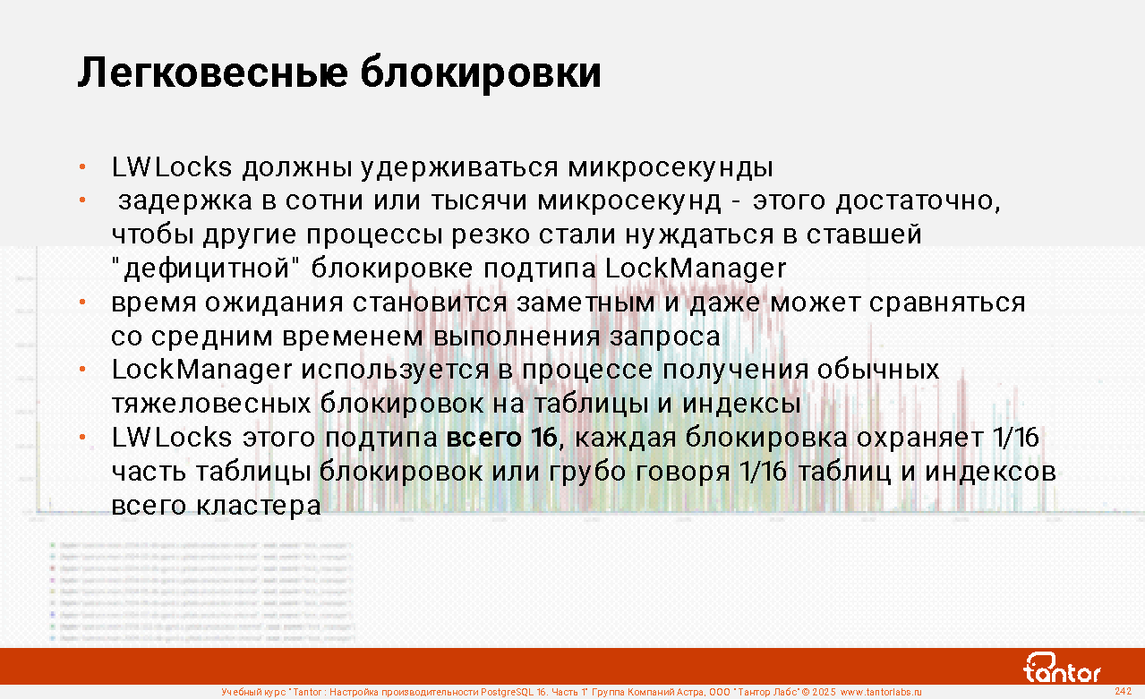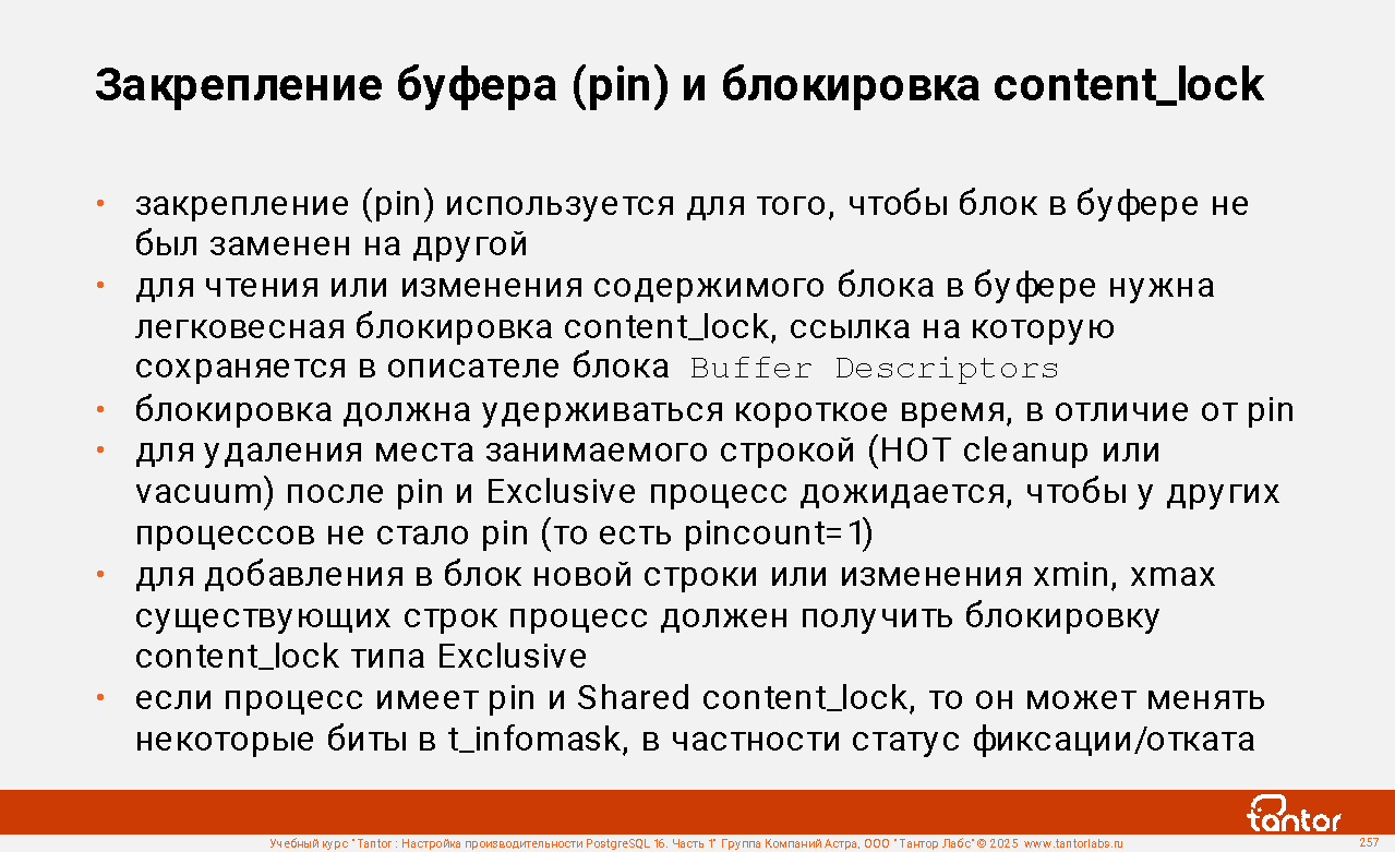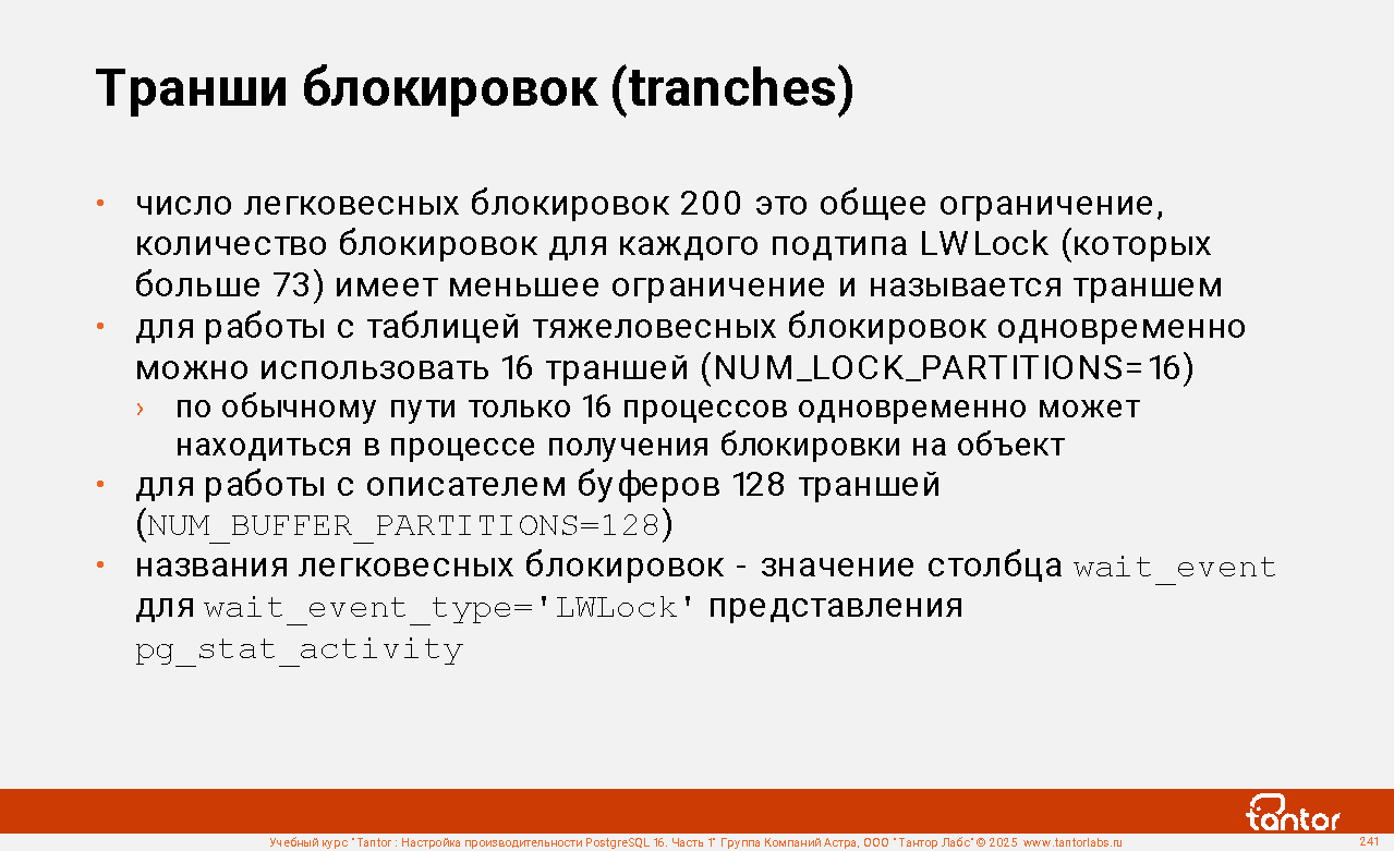 Процессы экземпляра используют ресурсы совместно и узким местом может стать конкуренция за получение доступа к ресурсу (resource starvation). Поэтому отдельно уделяется внимание блокировкам и событиям ожидания получения доступа к ресурсу.