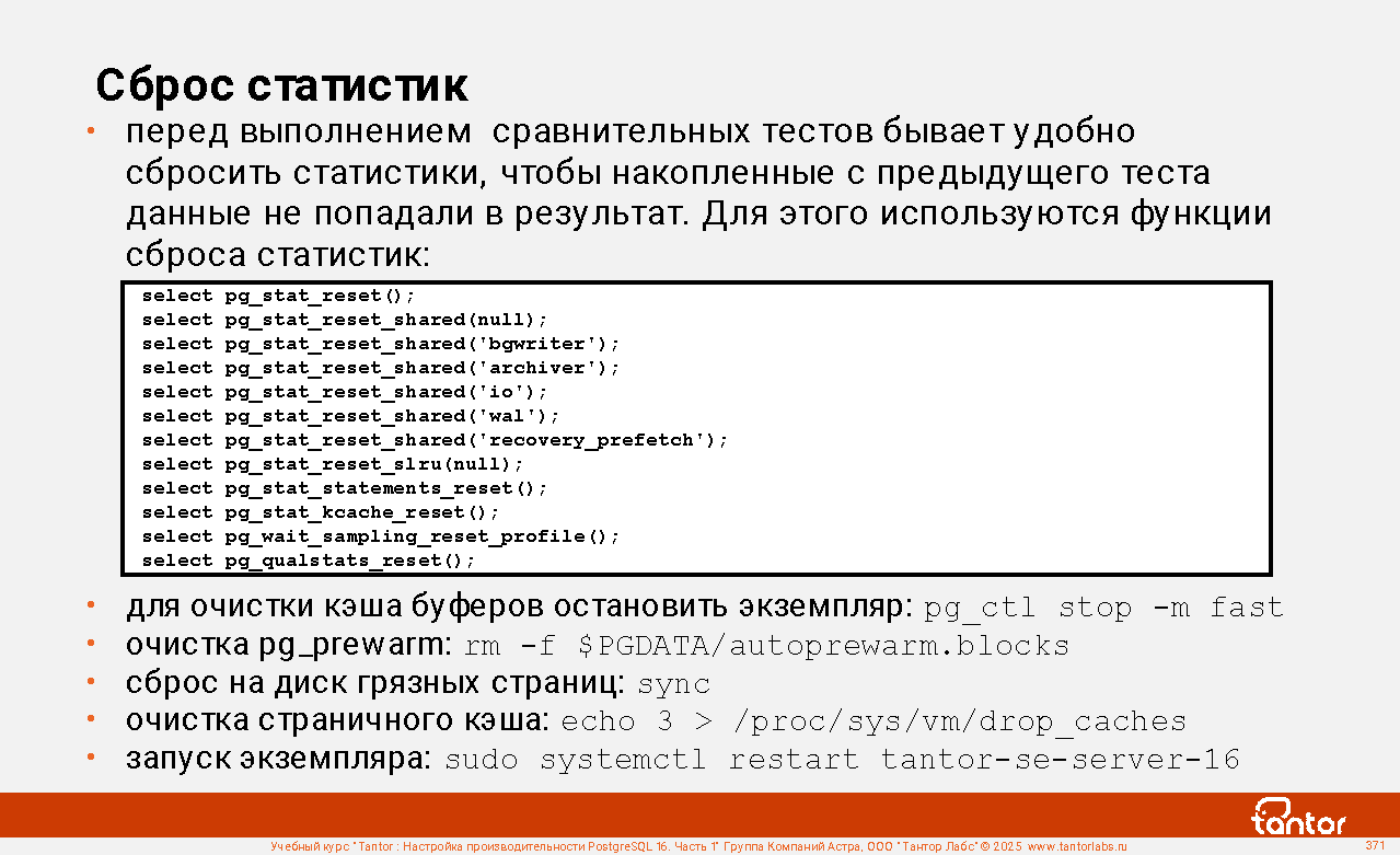 Перед выполнением сравнительных тестов бывает удобно сбросить статистики, чтобы накопленные с предыдущего теста данные не попадали в результат. Для этого используются функции сброса статистик:
