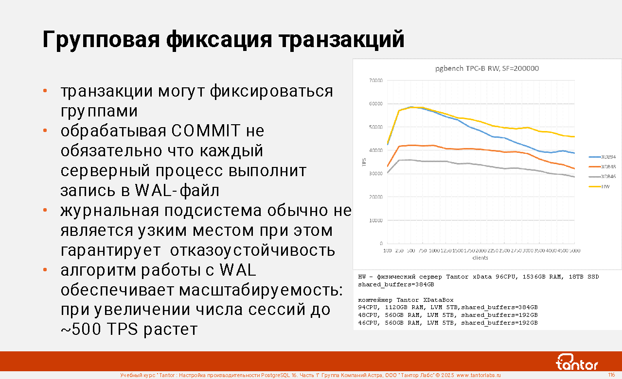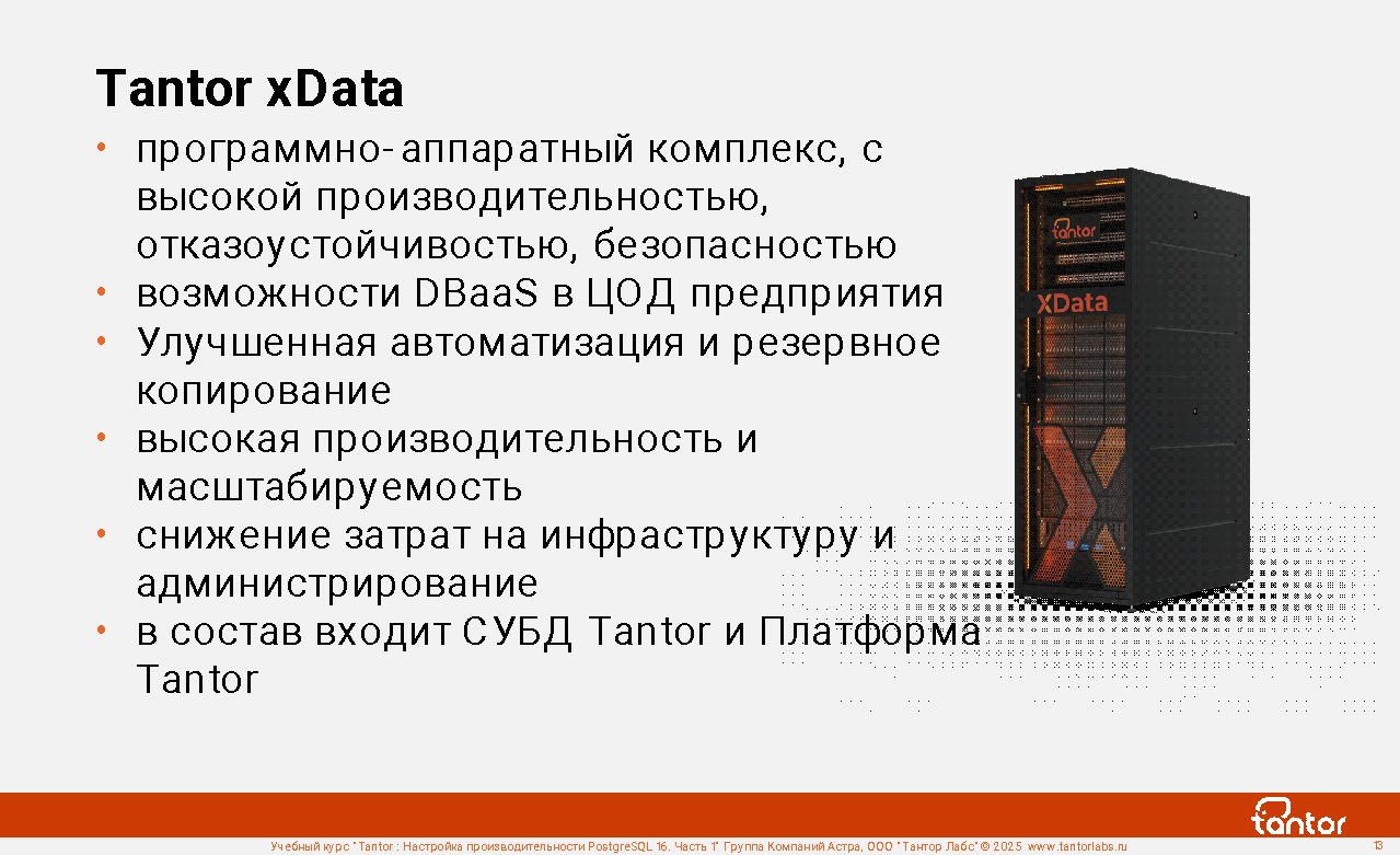 Программно-аппаратный комплекс (ПАК) Tantor XData обеспечивает рабочие нагрузки большого масштаба и критичности с высокой производительностью и доступностью. Консолидация различных рабочих нагрузок Tantor Special Edition на машина баз данных XData в корпоративных центрах обработки данных помогает организациям повысить операционную эффективность, сократить объем ИТ-администрирования и снизить затраты.