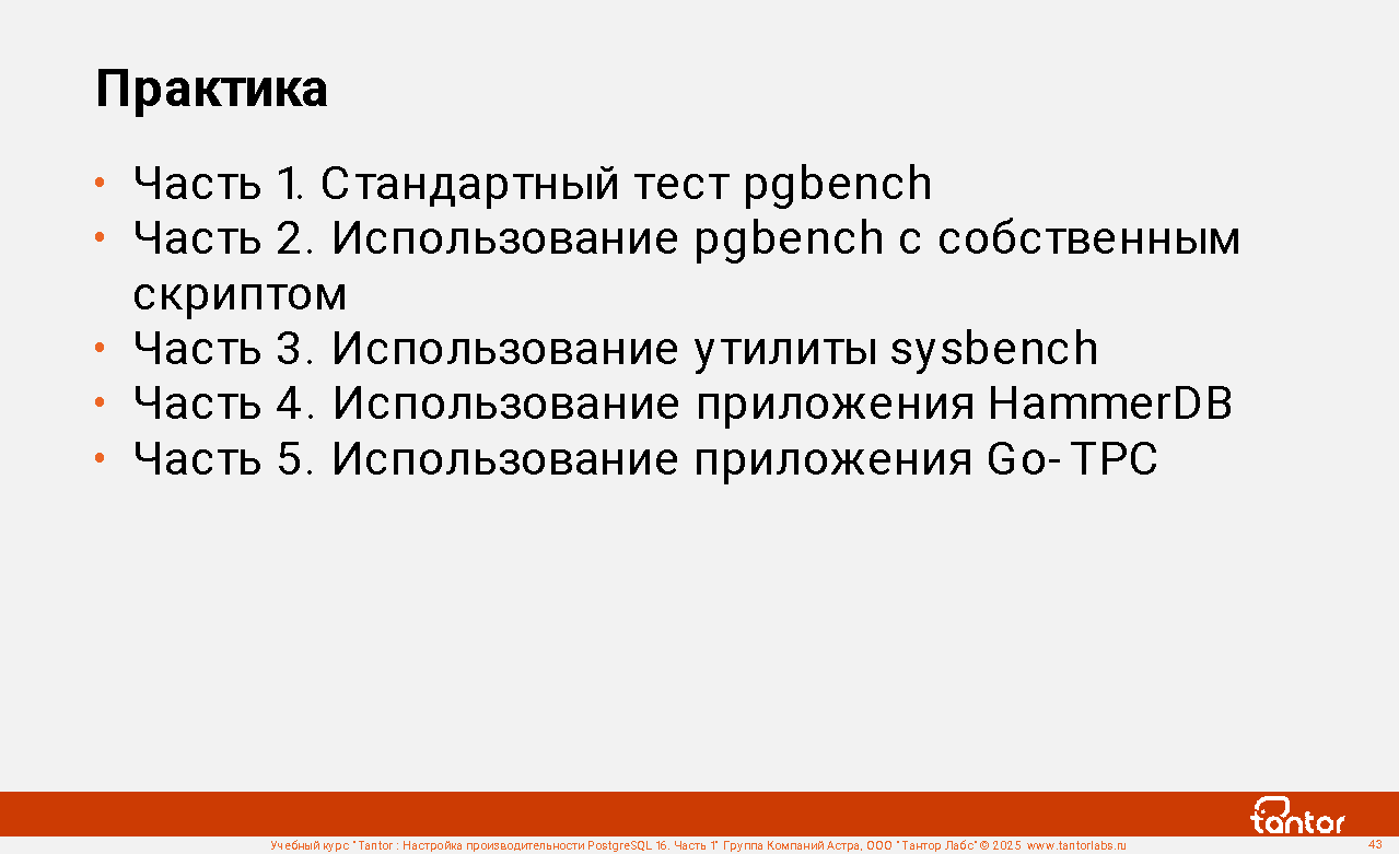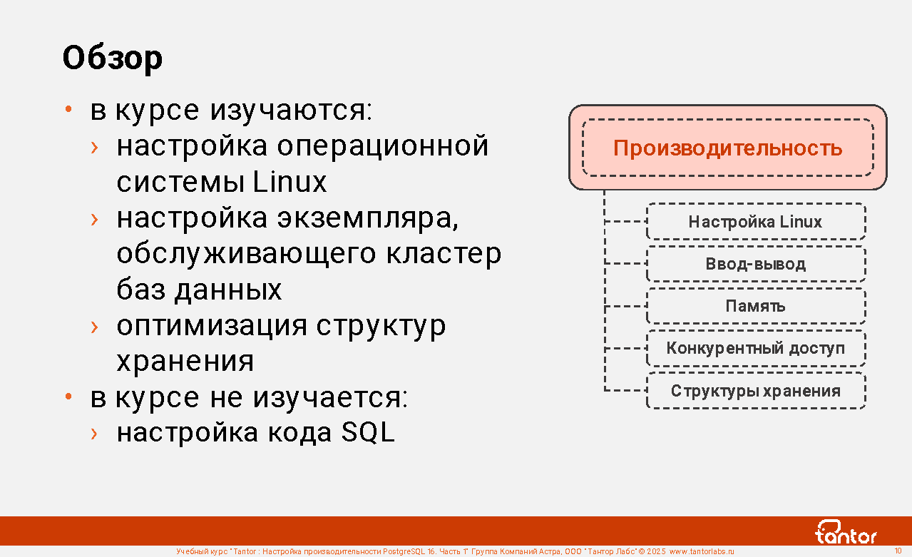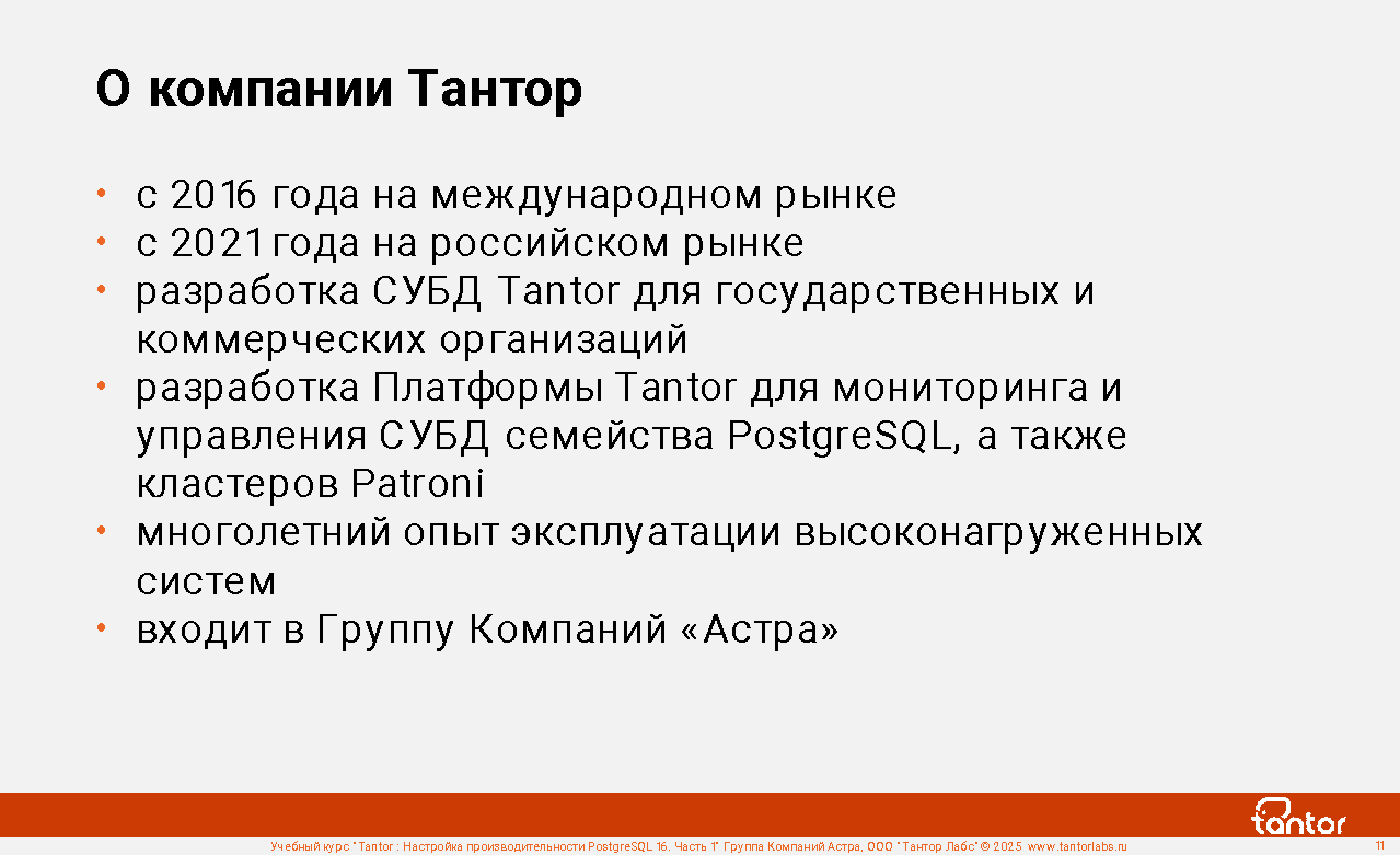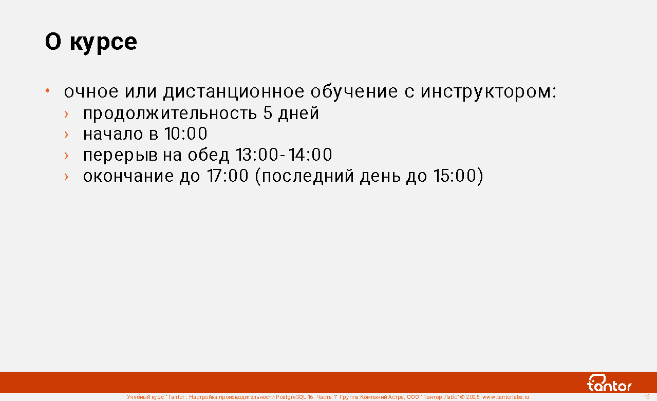 Курс предназначен для администраторов и разработчиков, в задачи которых входит настройка производительности работы приложений с СУБД PostgreSQL.