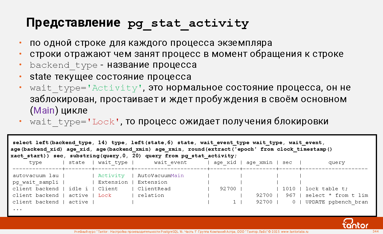 Столбец pid позволяет связать строки с представлением pg_stat_activity: