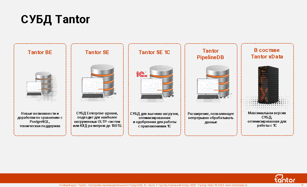 СУБД Tantor это реляционная база данных семейства PostgreSQL с повышенной производительностью и стабильностью. Выпускается в нескольких редакциях (сборках): BE, SE, SE1C, Certified. Редакция Special Edition для наиболее нагруженных OLTP-систем и хранилищ данных размерами до 100ТБ. Редакция Special Edition 1C для приложений 1С.