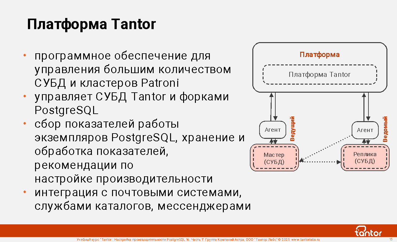 Платформа Tantor - программное обеспечение для управления СУБД Tantor, форками PostgreSQL, кластерами Patroni. Позволяет удобно управлять большим количеством СУБД. Относится к классу программных продуктов, в который входит Oracle Enterprise Manager Cloud Control.
