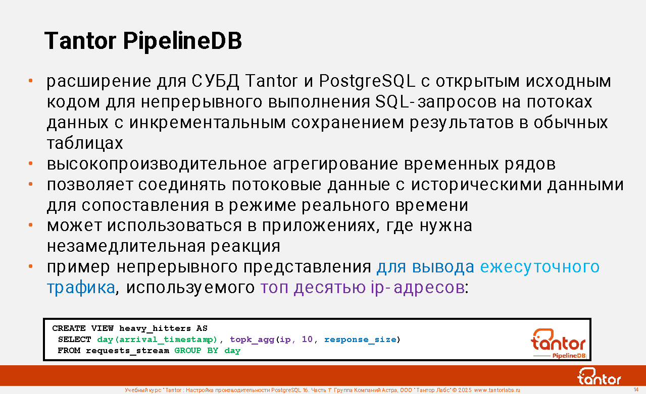 Tantor PipelineDB добавляет поддержку непрерывных представлений. Непрерывные представления - это материализованные представления с высокой скоростью обновления, инкрементально обновляемые в режиме реального времени.